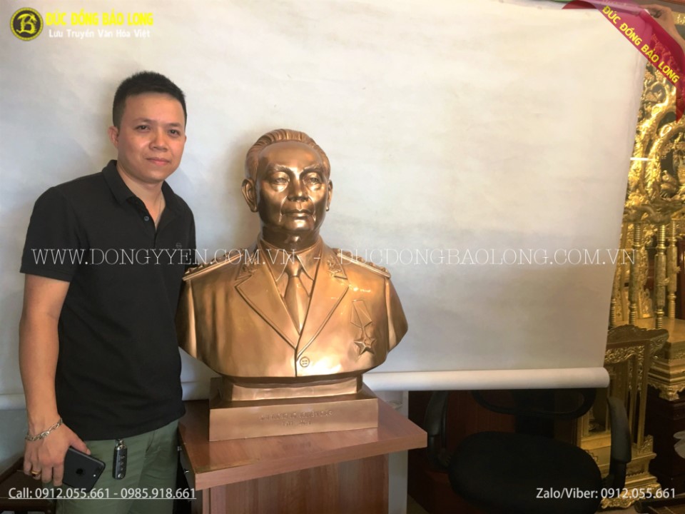 Tượng chân dung đại tướng Võ Nguyên Giáp được đúc hoàn toàn thủ công từ nguyên liệu bằng đồng đỏ thanh khiết, thuộc loại hàng đặt đúc rất dày dặn, nghệ nhân sửa nguội tinh xảo. Tượng bác cao 81cm nặng chừng trên 60kg. Tượng đại tướng phù hợp đặt tại phòng làm việc, phòng họp, văn phòng hay công ty, tập đoàn, cơ quan chính phủ, nhà nước hoặc các đơn vị cá nhân muốn lập bàn thờ đại tướng.