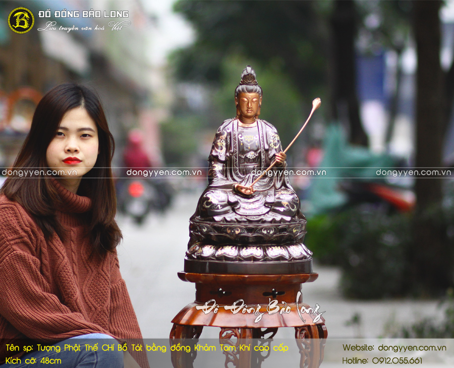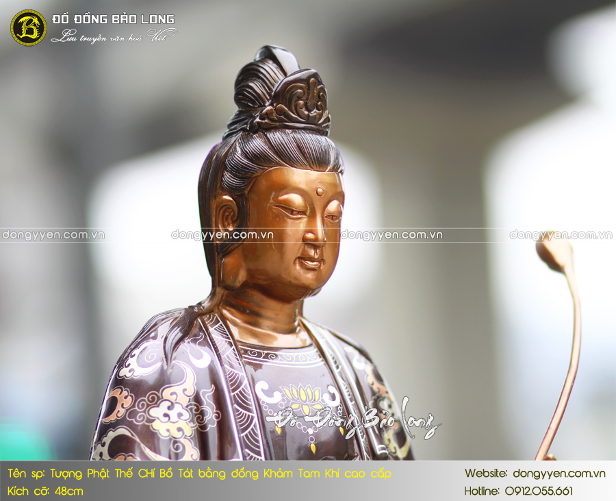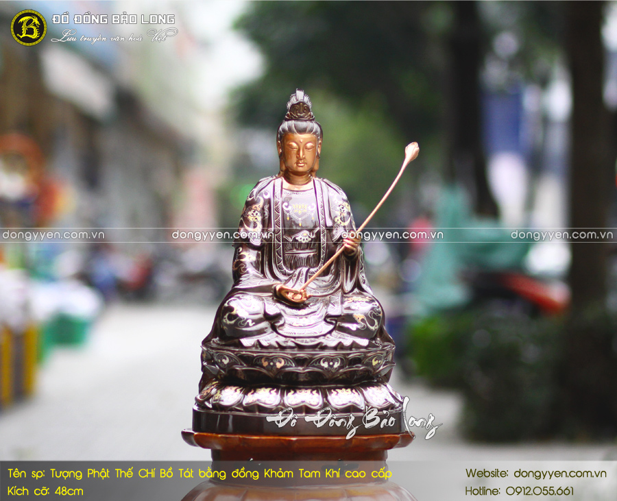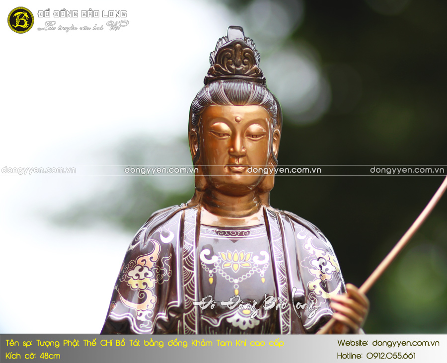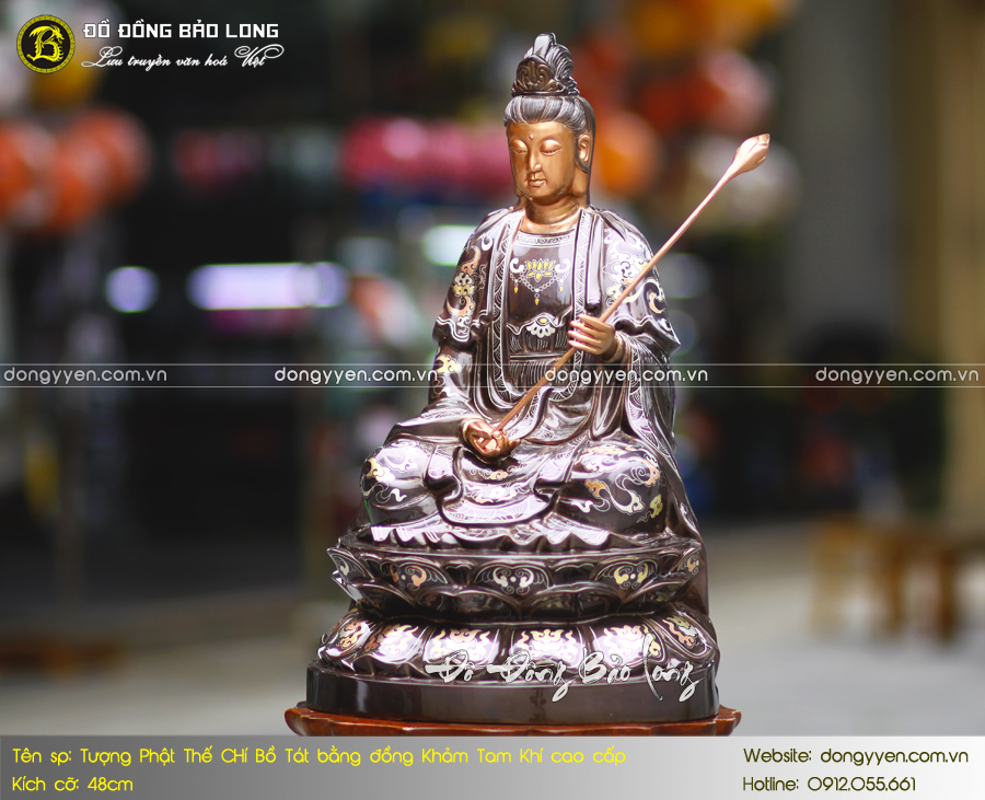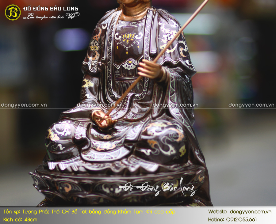 Tượng Đại Thế Chí Bồ Tát bằng đồng khảm Tam khí cao 48cm thuộc phân khúc tượng đồng cao cấp tại Bảo Long. Sản phẩm dược chế tác từ đồng đỏ thanh kiết, hoàn toàn thủ công 100%. Tượng có kiểu dáng độc đáo, chế tác cao cấp, chất lượng hàng đầu. Sản phẩm có kích thước nhỏ gọn, tinh xảo, thích hợp cho các phật tử thờ ban thờ tại gia.