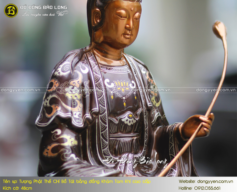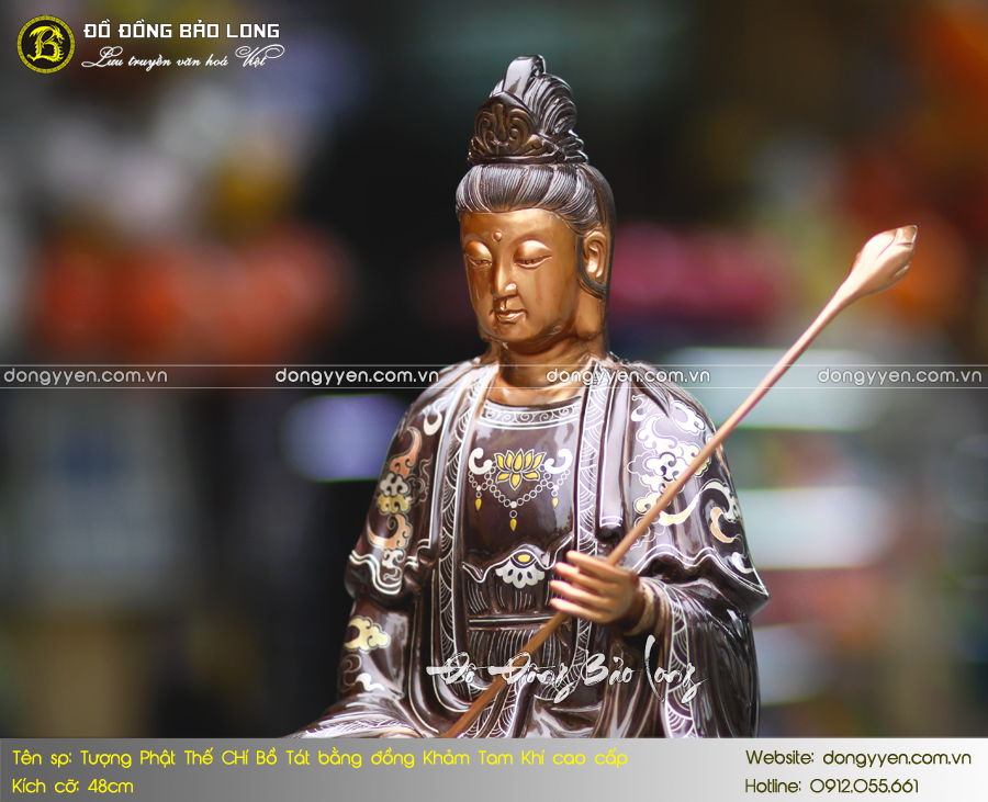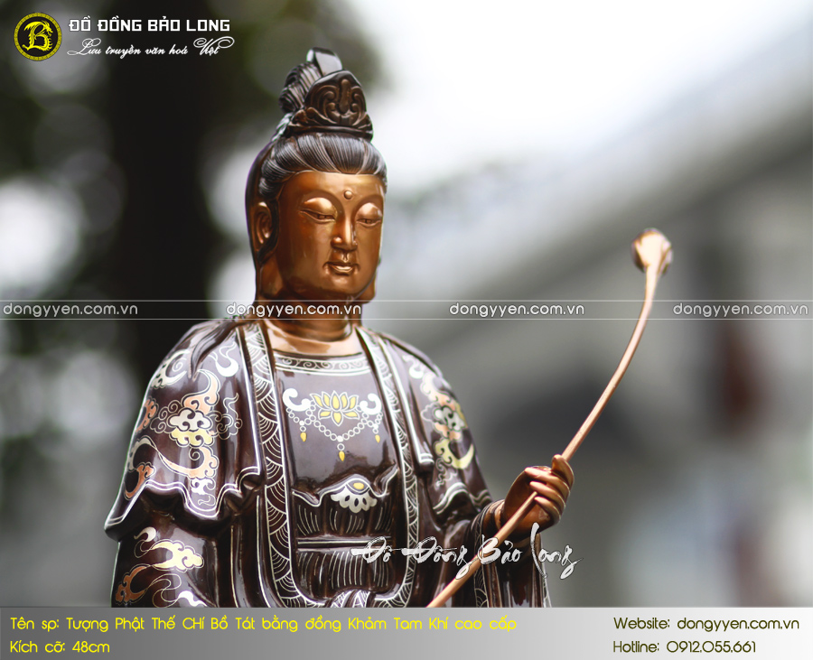 Pho tượng Bồ Tát được khảm tam khí tại Bảo Long được chế tác thủ công 100% bởi các nghệ nhân từ chất liệu đồng đổ thanh khiết. Bề mặt được khảm 3 loại kim khí quý tạo độ sắc nét cho hoa văn và các chi tiết. Việc này giúp cho pho tượng có sự độc đáo riêng những vẫn giữ được cái "Thần" trong pho tượng. Nhìn từ dáng vẻ bề ngoài, người không có chuyên môn cũng có thể cảm nhận được "hồn" của pho tượng, không cứng nhắc, vô hồn như những tượng được đúng hàng loạt. Tượng Đại Thế Chí bằng đồng cũng dễ dàng cho các nghệ nhân sử lí các chi tiết, đường nét tinh vi hơn, chuẩn chỉnh nhất.