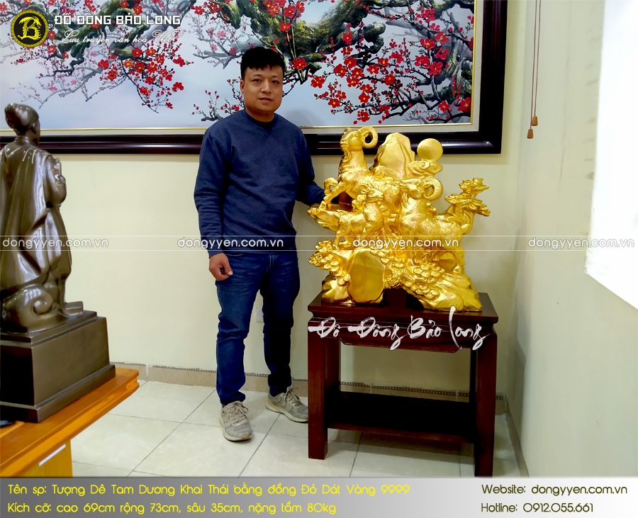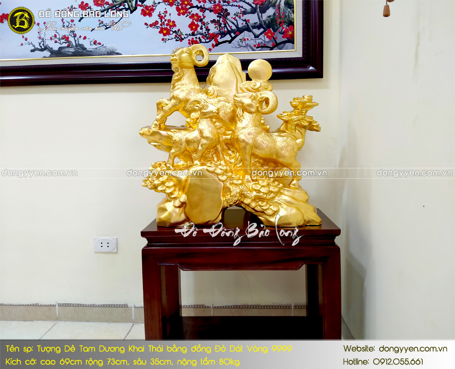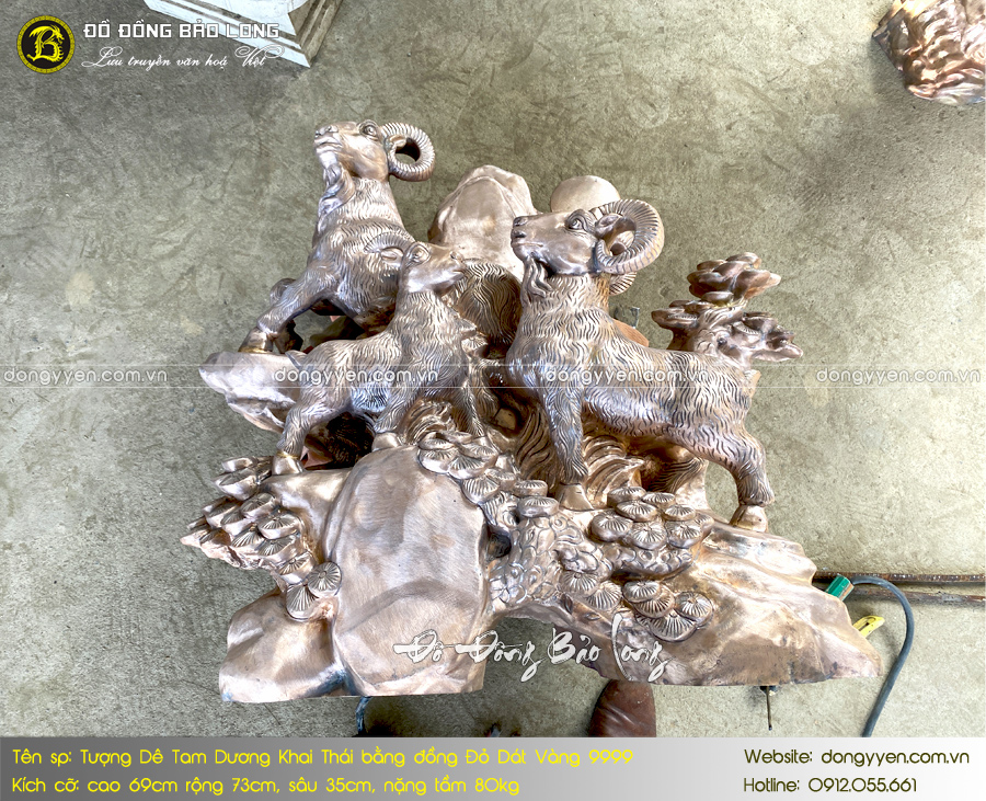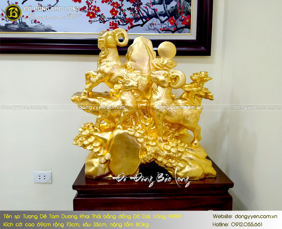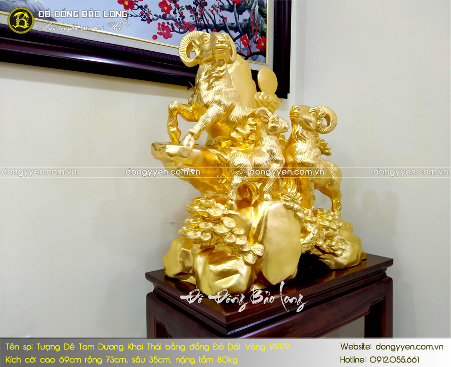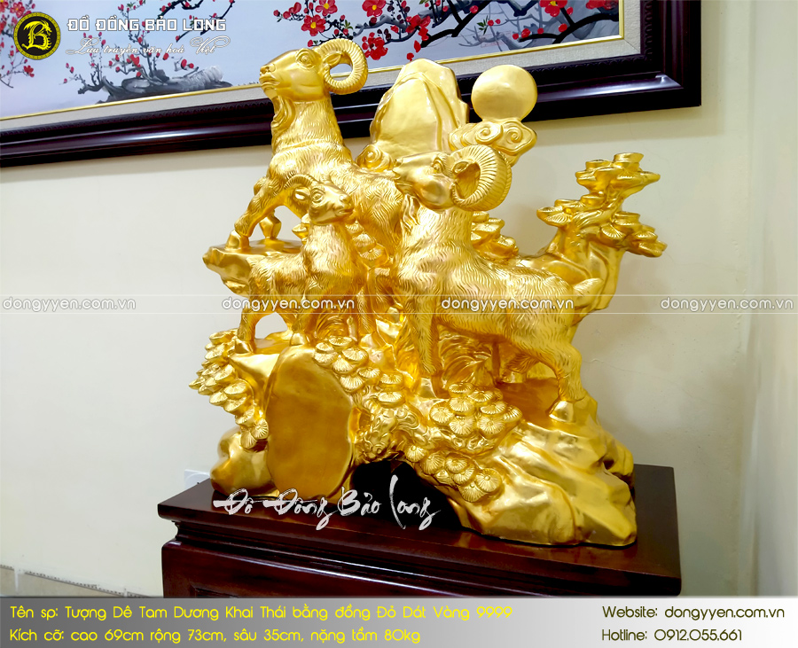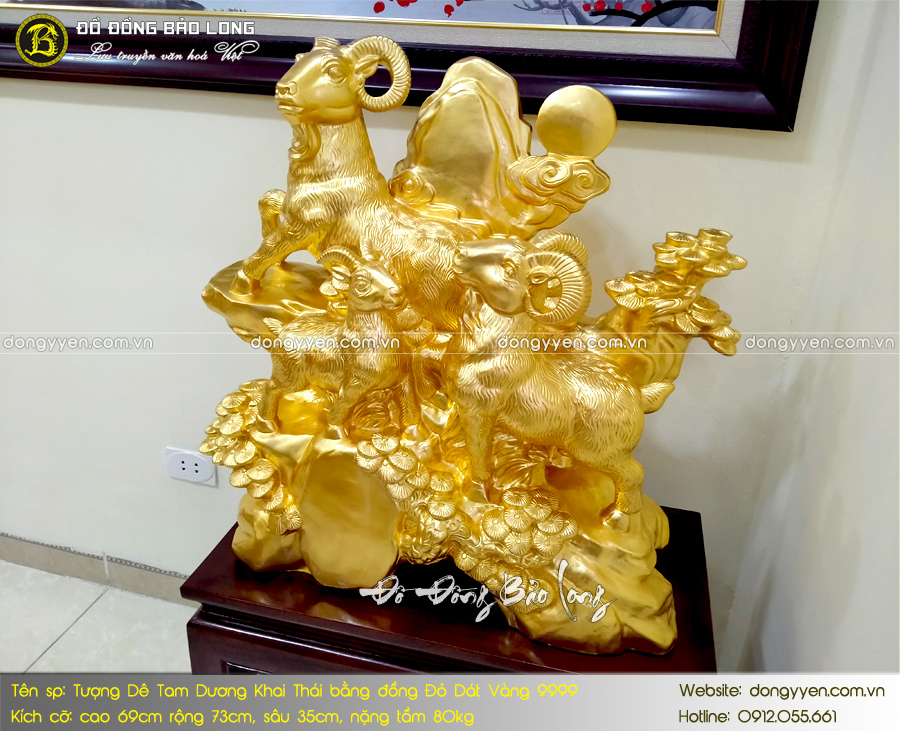 Tượng Dê Tam Dương Khai Thái dát vàng cao 69cm là một trong những tượng linh vật phong thủy được nhiều người ưa chuộng. Pho tượng được đúc thủ công, bề mặt thếp lá vàng ta theo phương pháp truyền thống. Sản phẩm không chỉ tăng vẻ đẹp cho không gian mà còn mang ý nghĩa phong thủy tốt cho gia đình.