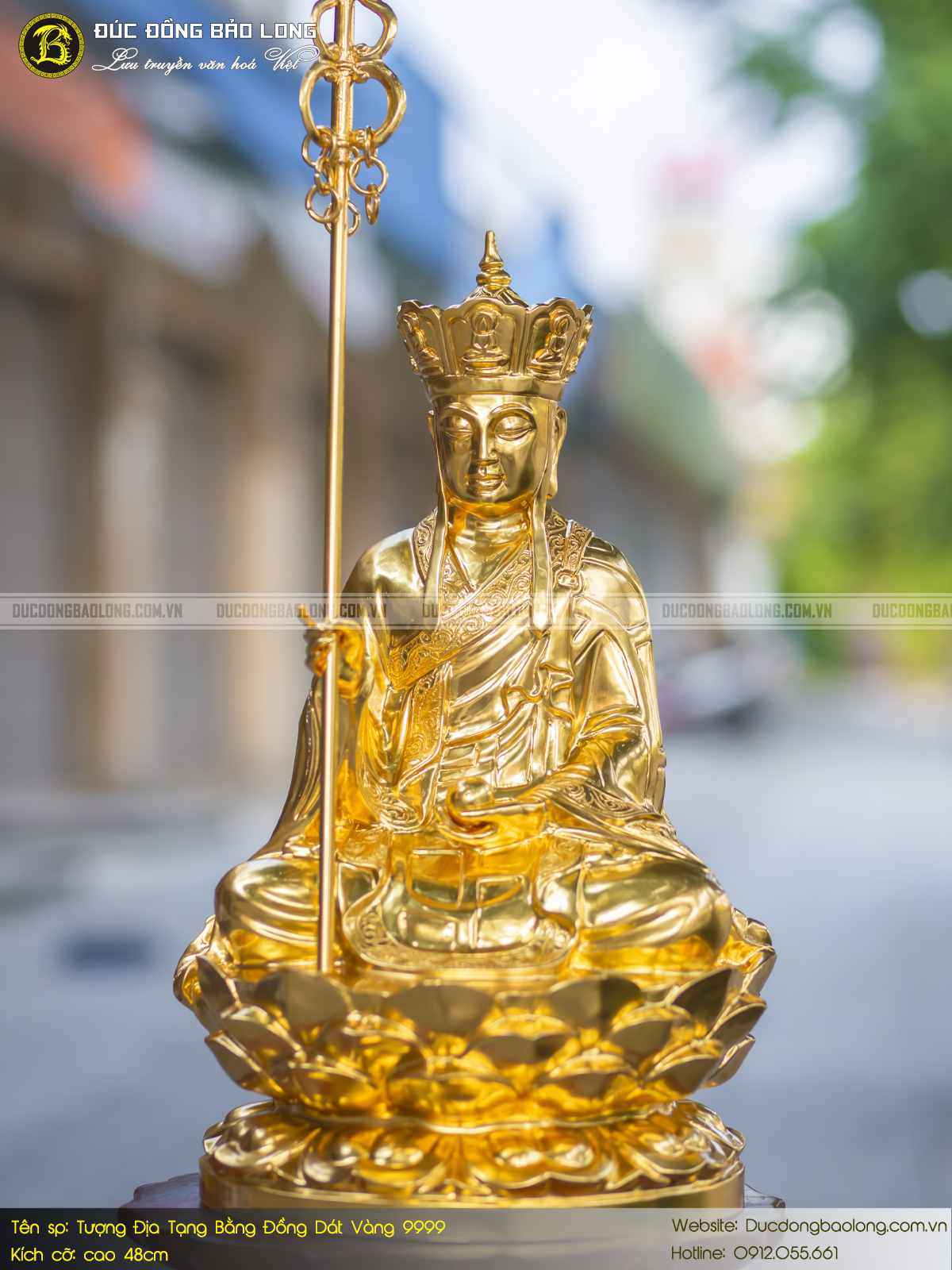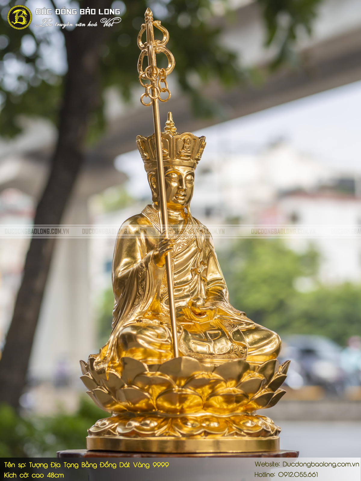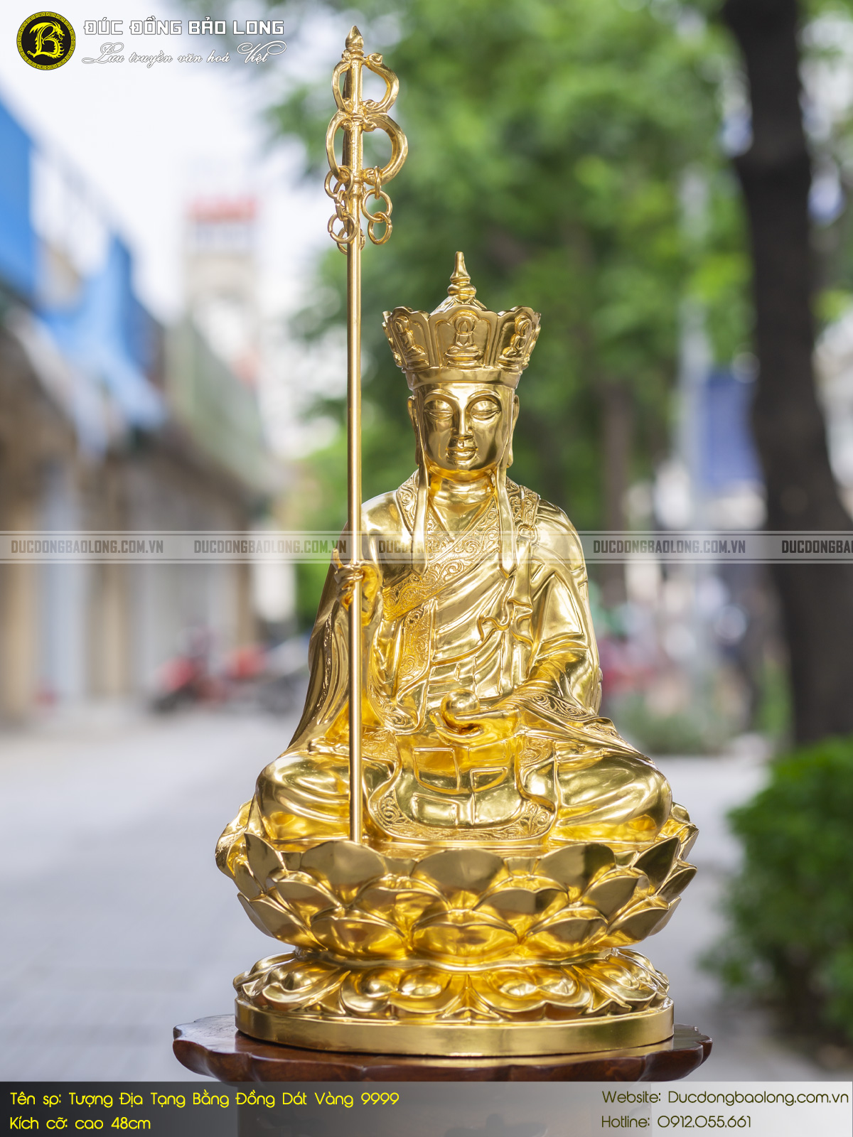 Tượng Địa Tạng Vương Bồ Tát bằng đồng dát vàng cao 48cm là mẫu tượng Phật thuộc phân khúc cao cấp tại cơ sở Đúc Đồng Bảo Long. Pho tượng được đúc nguyên khối bằng đồng đỏ loại I, bề mặt dát vàng 9999 cao cấp, sang trọng, cho tuổi thọ sử dụng cực cao.