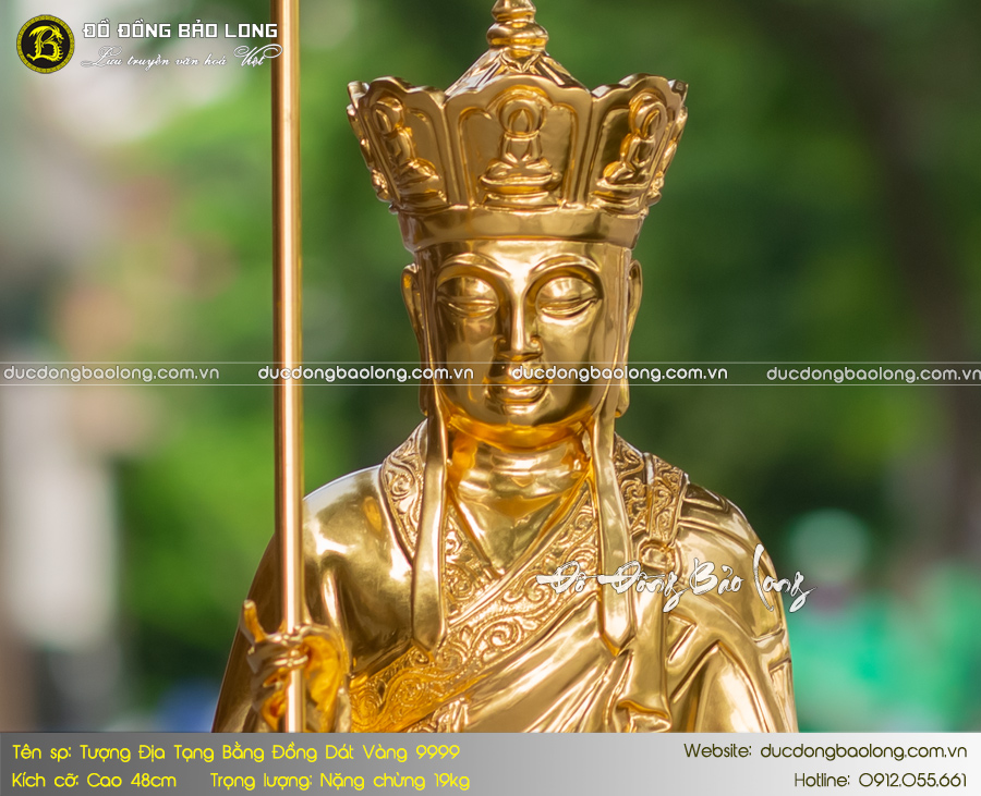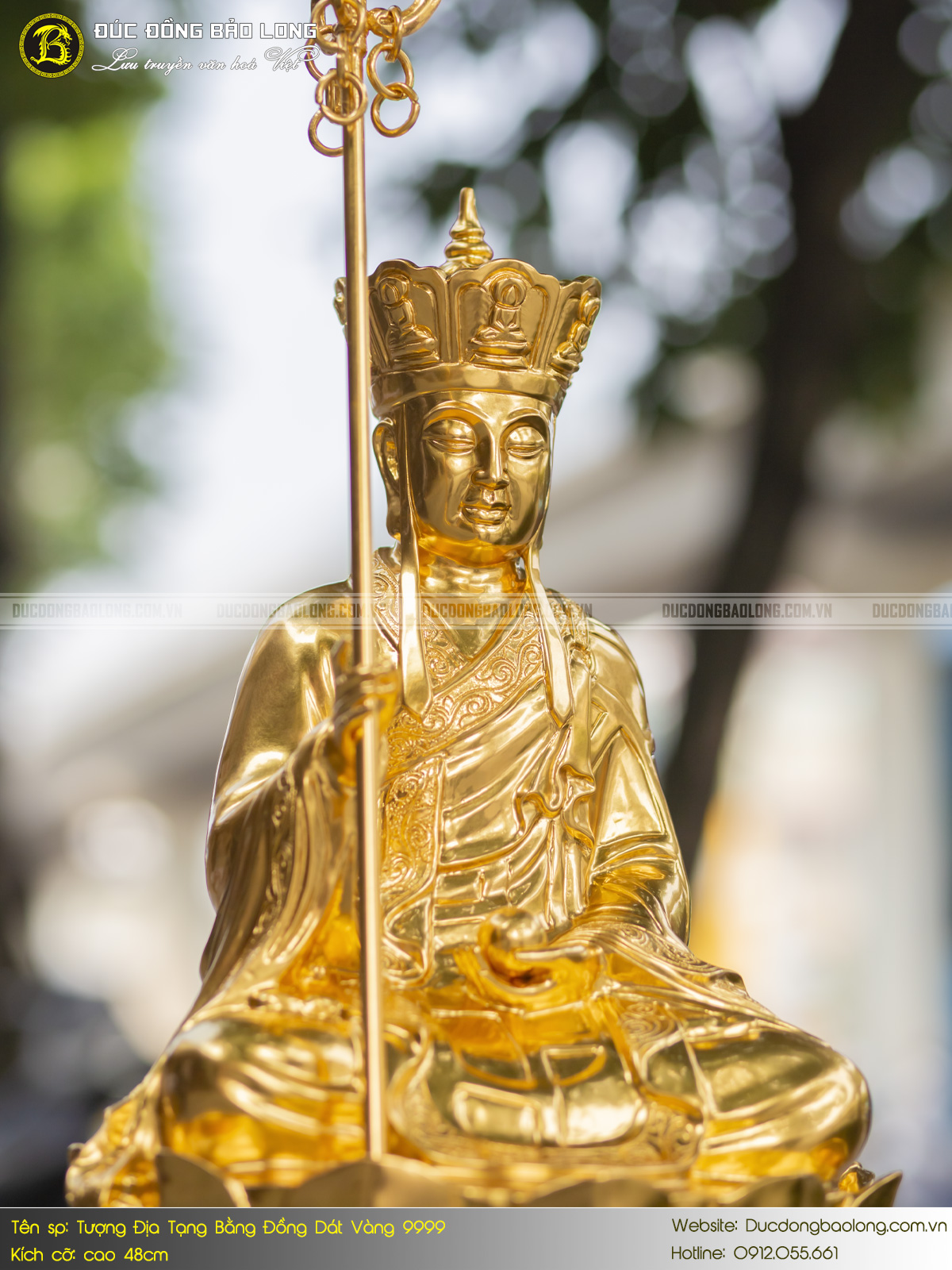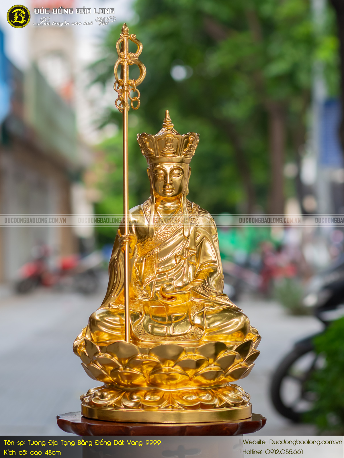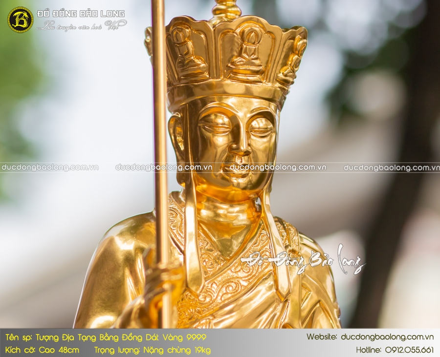 Tượng Địa Tạng Vương Bồ Tát bằng đồng dát vàng cao 48cm là mẫu tượng Phật thuộc phân khúc cao cấp tại cơ sở Đúc Đồng Bảo Long. Pho tượng được đúc nguyên khối bằng đồng đỏ loại I, bề mặt dát vàng 9999 cao cấp, sang trọng, cho tuổi thọ sử dụng cực cao.