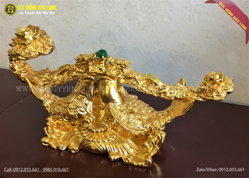 Tượng đôi cá chép ngậm gậy như ý được đúc tinh xảo, sắc nét từ nguyên liệu đồng vàng và được dát vàng lên toàn bộ sản phẩm. Sản phẩm có chiều cao 19cm, dài 30cm.