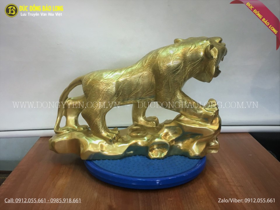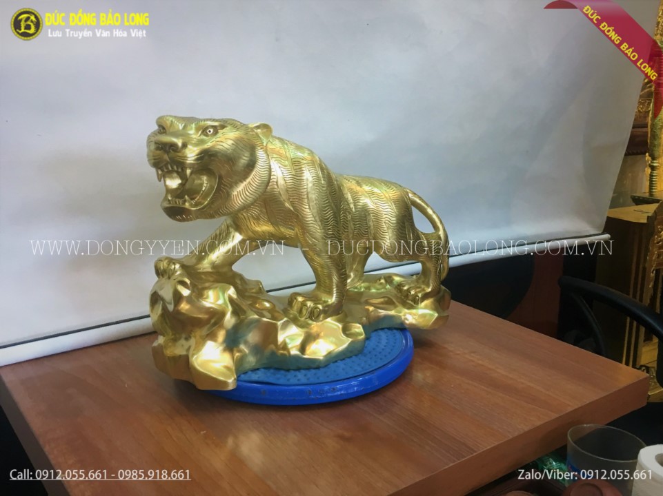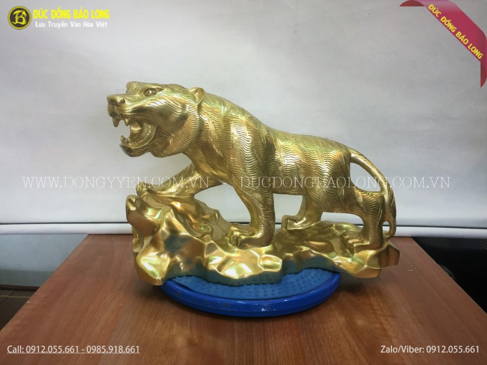 Tượng Hổ Bằng Đồng Catut Cao 40cm nằm trong bộ linh vật phong thủy bằng đồng được cơ sở Bảo Long hoàn thiện và đưa ra thị trường hoàn toàn theo mẫu mới, đẹp, sắc nét hơn rất nhiều. Hổ là hình ảnh biểu trưng cho sức mạnh và uy quyền được dân gian tôn kính với những giai thoại đặc biệt. Người tuổi Dần thường đặc trưng với tính cách điềm đạm, nhẫn nại, có khả năng phản ứng nhanh trong nhiều trường hợp khác nhau, vì thế thích hợp để làm lãnh đạo hoặc người dẫn đầu. Linh Vật cho người tuổi Dần có hình dáng Chúa Sơn Lâm thị uy trên núi, thể hiện khí phách thủ lĩnh, dũng mãnh vô song, muôn loài quy thuận, có tác dụng giữ an bản mệnh, phát triển công danh, kích thâu tài lộc. Ngày nay, tượng hổ được ưa chuộng khá nhiều vì những lợi ích phong thủy đặc biệt của nó.