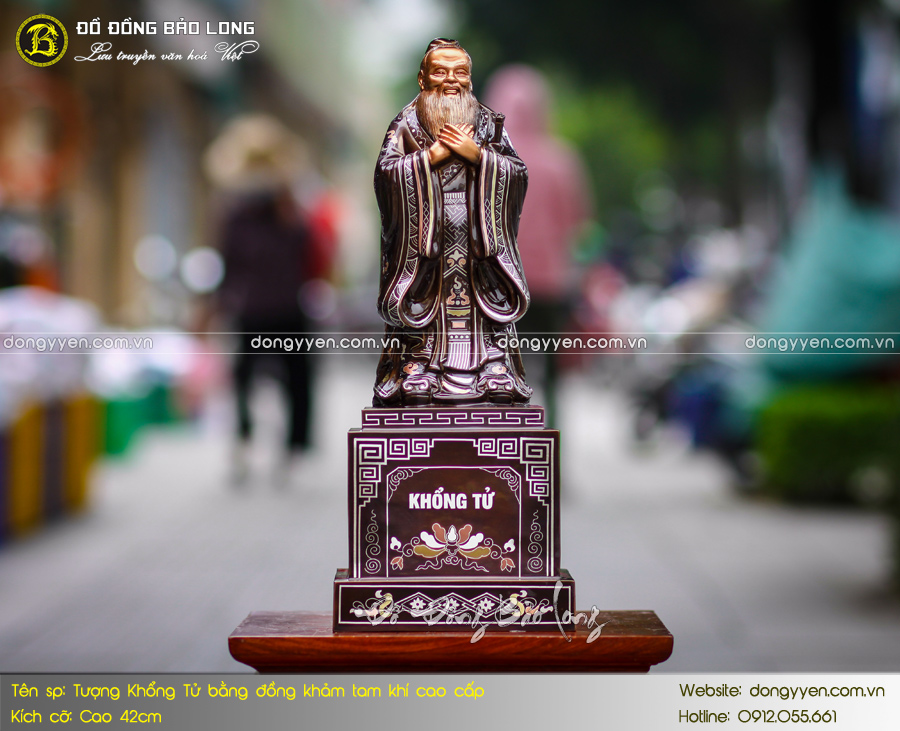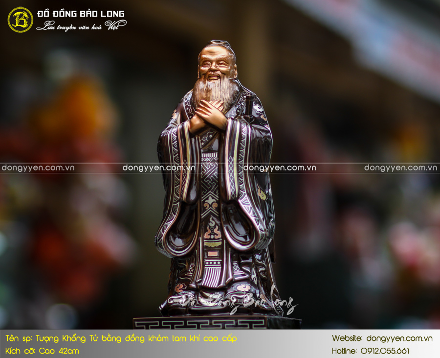 Tượng Khổng Tử khảm Tam khí bệ vuông cao 42cm thích hợp bày trong phòng khách, phòng làm việc hay làm quà tặng. Sản phẩm dược chế tác từ đồng đỏ thanh kiết, hoàn toàn thủ công 100%. Tượng có kiểu dáng độc đáo, chế tác cao cấp, chất lượng hàng đầu.