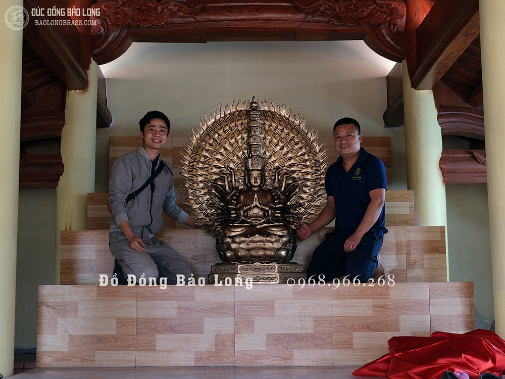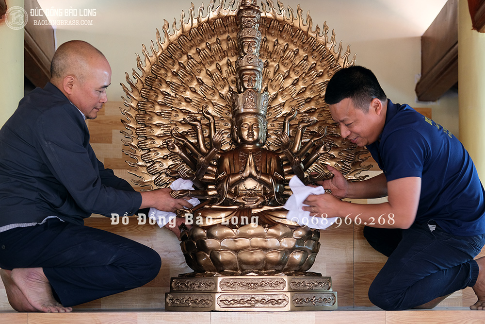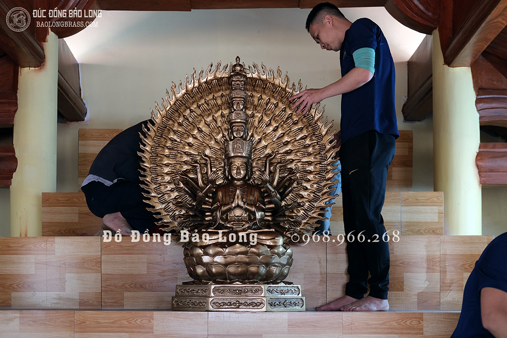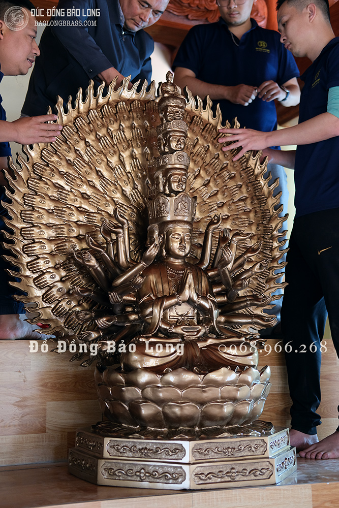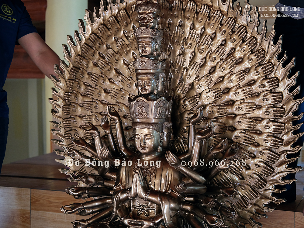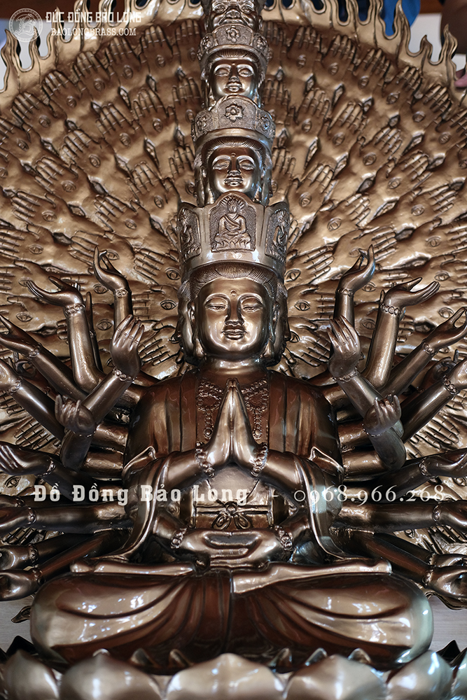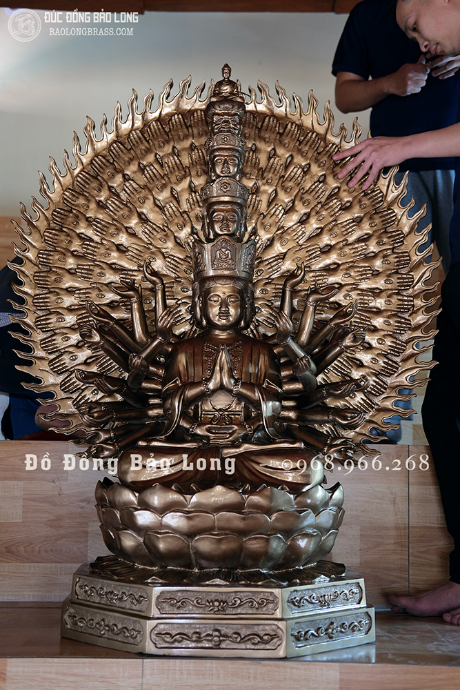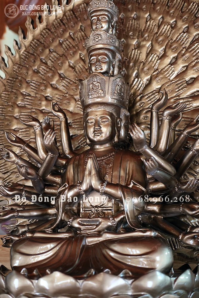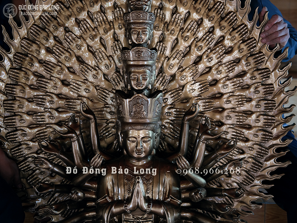 Các chi tiết hàng nghìn cánh tay, con mắt, khuôn mặt từ bi cùng bệ sen đều được thể hiện tỉ mỉ, cân đối và hài hòa. Đây là tượng Phật bằng đồng có giá trị nghệ thuật cao, phù hợp đặt tại không gian thờ Phật, chùa chiền hoặc phòng thờ gia đình, giúp lan tỏa năng lượng an lành và từ bi.