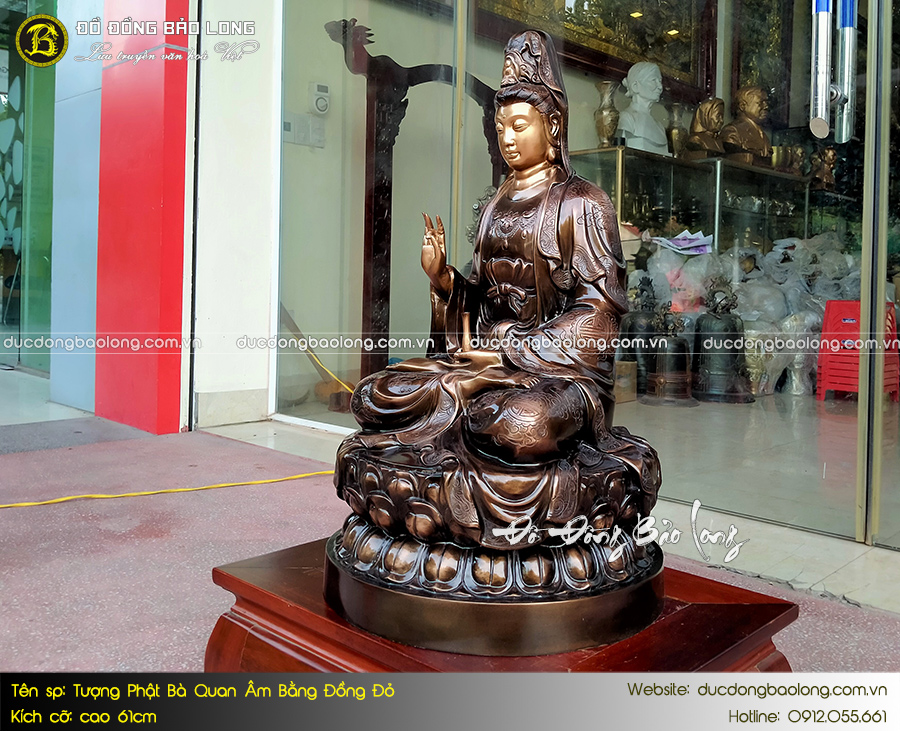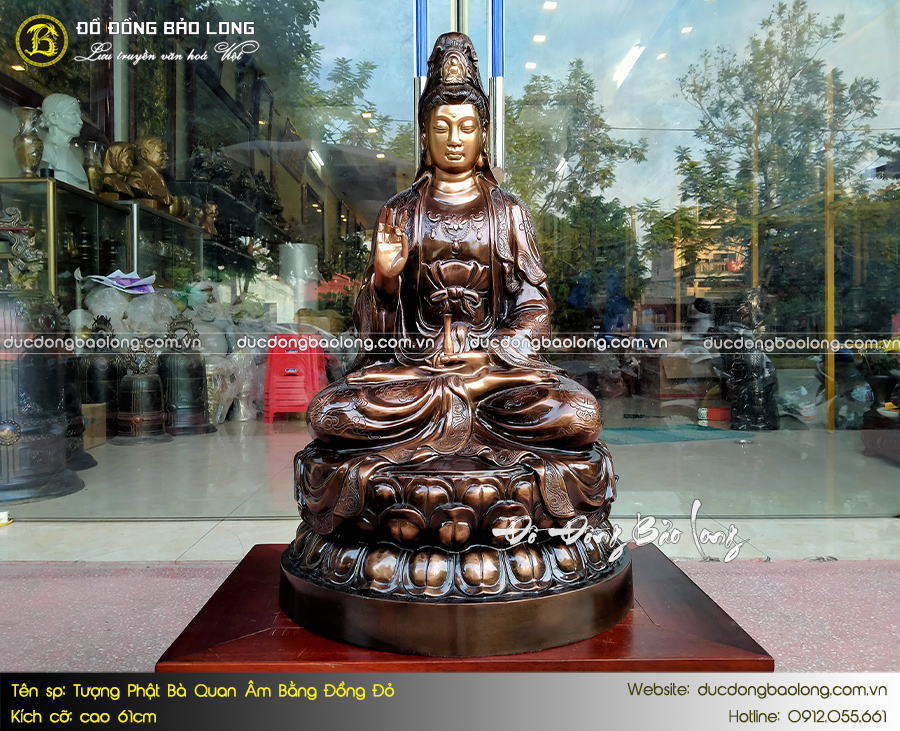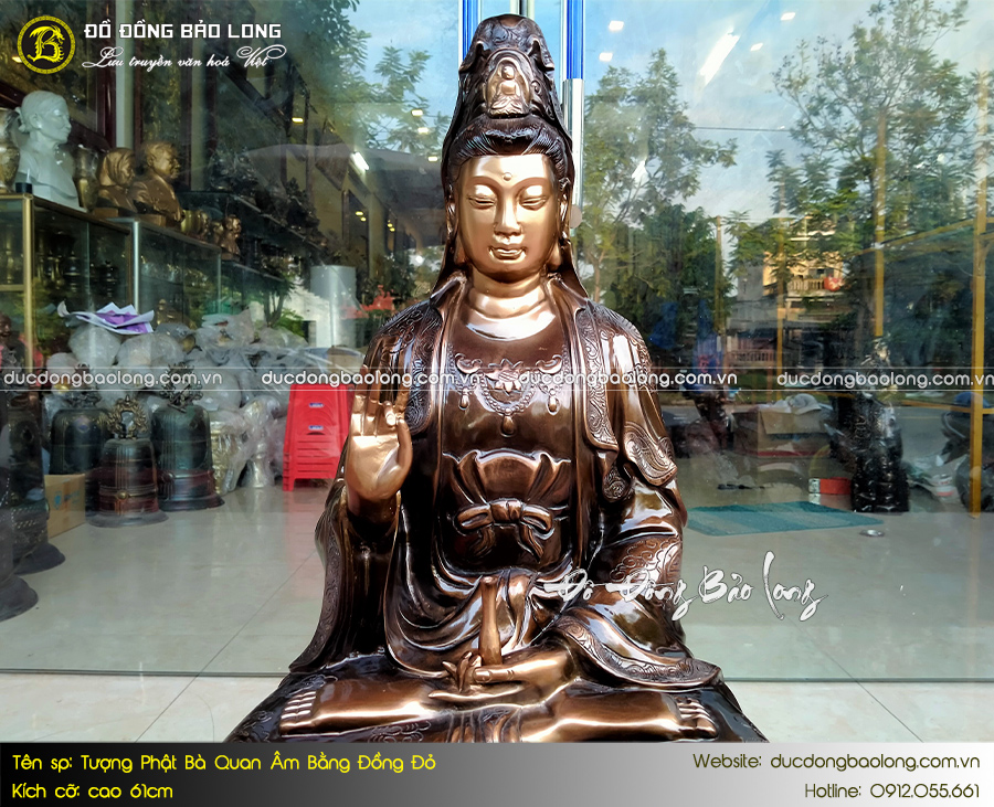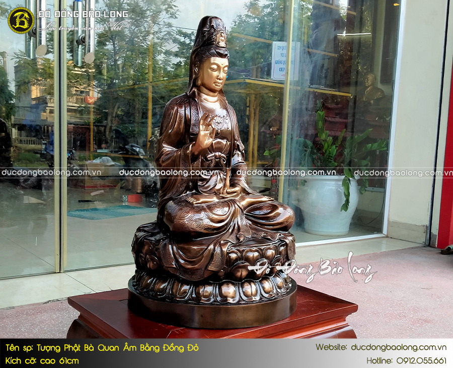 Tượng Phật Bà Quan Âm bằng đồng đỏ hạ màu thời gian cao 61cm là mẫu tượng chuẩn, được tôn tạo và chế tác bởi các nghệ nhân cơ sở Đúc Đồng Bảo Long. Nổi bật bởi hình khối chuẩn, chất lượng hoàn thiện tốt, diện mặt thần thái, sắc nét đến từng chi tiết, pho tượng được các sư thầy và giới chuyên môn đánh giá cao.