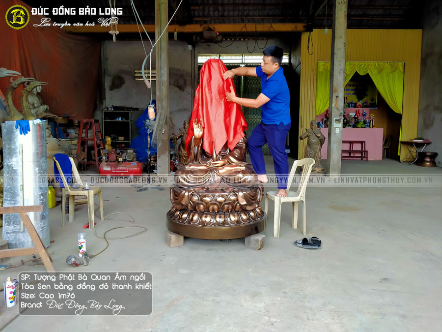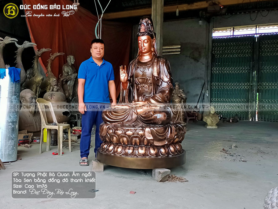 Pho tượng Phật Bà Quan Âm tọa đài sen đồng đỏ cao 1m76 được các nghệ nhân hàng đầu cơ sở Đúc Đồng Bảo Long tâm huyết tạo dựng. Đây là mẫu tượng Phật đẹp, được chế tác thủ công bằng chất liệu đồng đỏ tuyển chọn, trải qua rất nhiều công đoạn chế tác. Pho tượng được các quý Phật tử, quý thầy đánh giá cao bởi diện mặt thần thái, tươi tắn, hình khối tượng tỉ lệ, cân xứng.