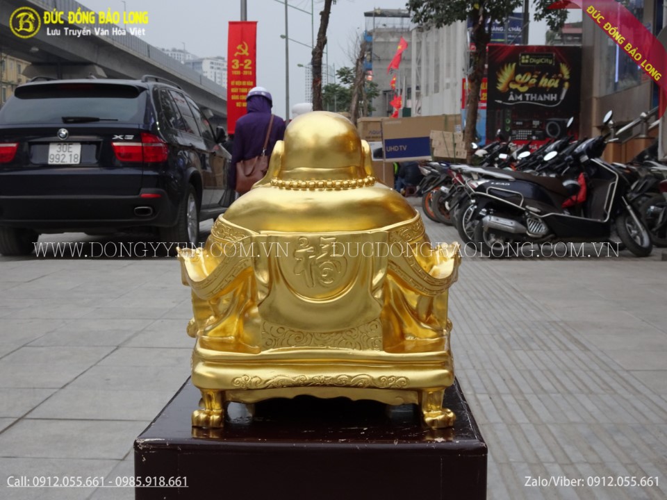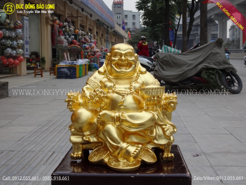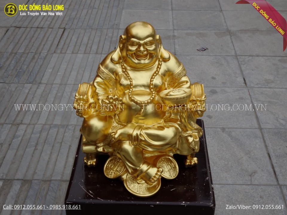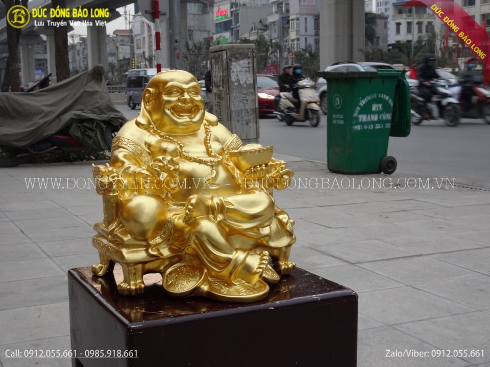 Tượng Phật Di Lặc ngồi ngai cao 35cm được các nghệ nhân của chúng tôi chế tác hoàn toàn thủ công từ nguyên liệu đồng đỏ, sản phẩm được chạm rất tỉ mỉ, sắc nét. Tượng Di Lặc được tiến hành dát vàng 9999 toàn bộ sản phẩm. Tượng có chiều cao tổng thể là 35cm, nặng chừng 27kg. Tượng có hình dáng Phật Di Lặc ngồi với tư thế ngài ngồi vắt chân trên ngai, một tay cầm quạt, một tay cầm tiền.