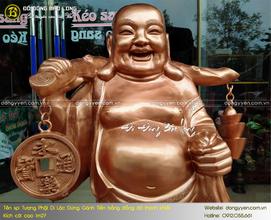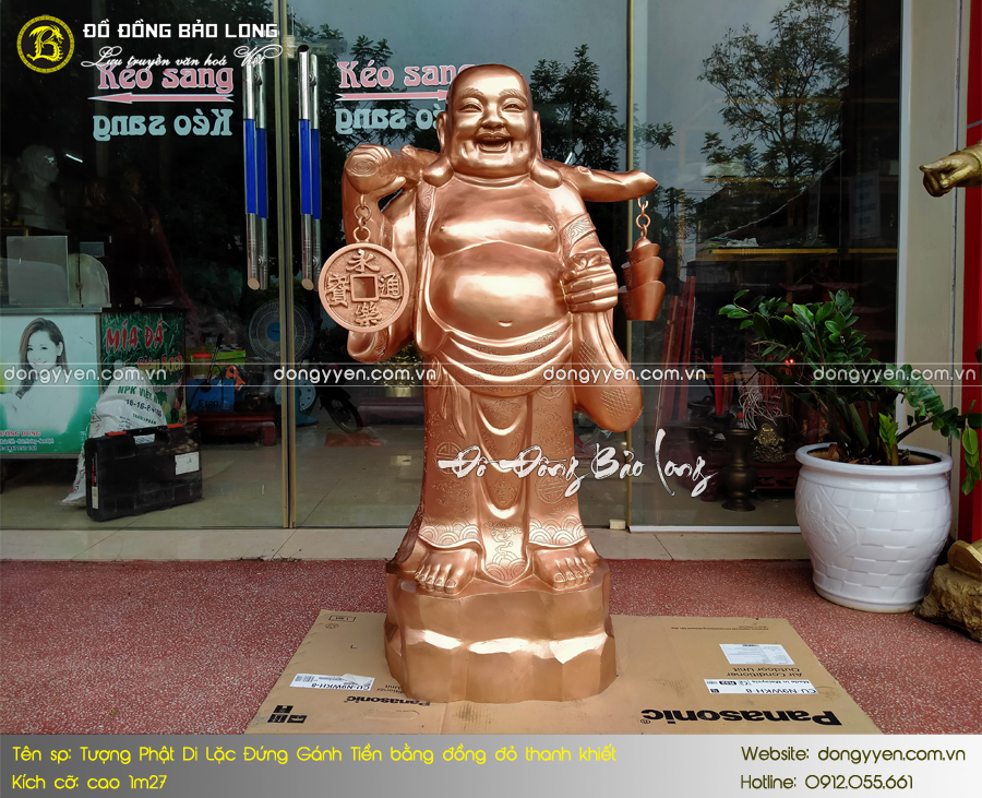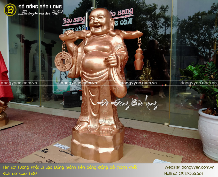 Tượng Phật Di Lặc đúng gánh tiền bằng đồng đỏ 1m27