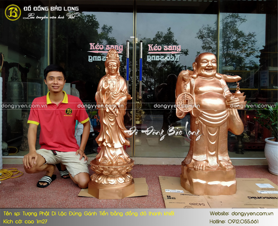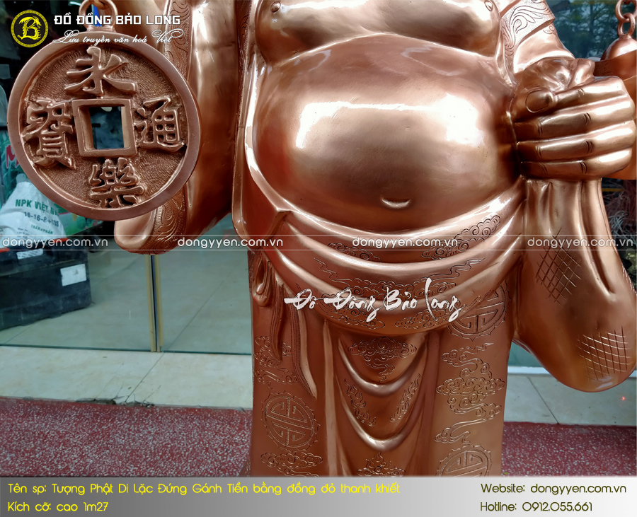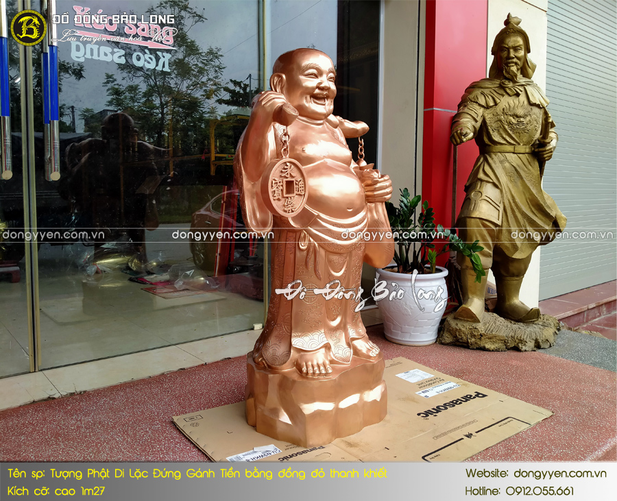 Tượng Phật Di Lặc đứng gánh tiền bằng đồng đỏ 1m27 mới được Bảo Long hoàn thành, vận chuyển tới phòng thờ của khách hàng Nghệ An. Pho tượng được đúc thủ công từ đồng đỏ thanh khiết, cao cấp. Tượng kiểu dáng đúng, trên vai gánh đồng tiền ngụ ý may mắn.