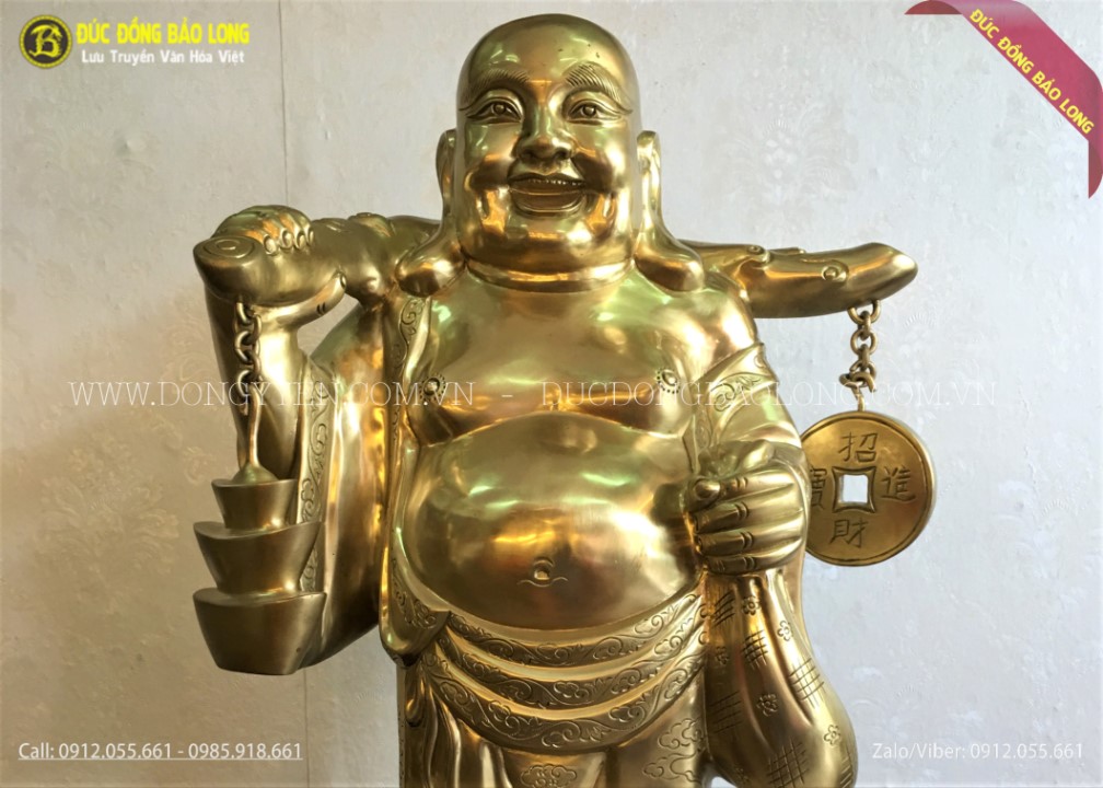 Tượng Phật Di Lặc đứng vác gậy như ý, 1 tay cầm bao tiền thể hiện sự bình an, hạnh phúc lẫn sự sung túc, may mắn tài lộc. Bức tượng này được đúc hoàn toàn thủ công từ đồng catut, đúc theo mẫu chuẩn, mặt đẹp có nụ cười vô tư sảng khoái. Tượng phật di lặc 72cm được đúc hết sức tinh xảo, sắc nét, tượng được xử lý đánh bóng qua 8 cấp giấy ráp khi hoàn thiện tượng lên màu óng vàng như vàng tây rất đẹp. Tượng di lặc cao 72cm phù hợp để bày phòng khách, phòng thờ, phòng làm việc. Nụ cười của ngài sẽ xua tan bao phiền muộn lo âu, đem lại sự thăng bằng về tinh thần cũng như thể chất con người đồng thời bày ngài nơi kinh doanh sẽ có tác dụng chiêu tài lộc, may mắn rất tốt.