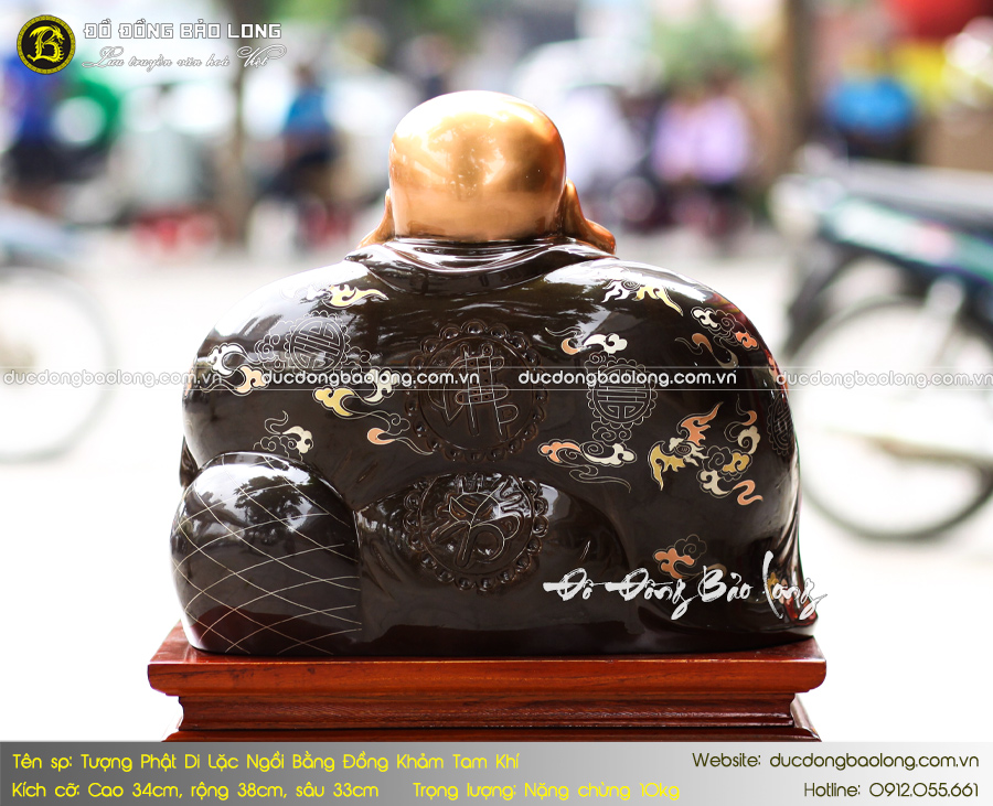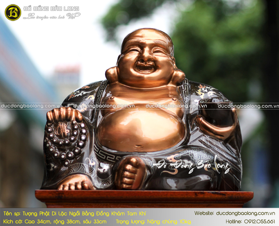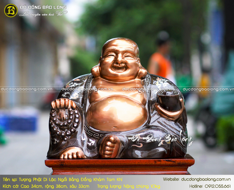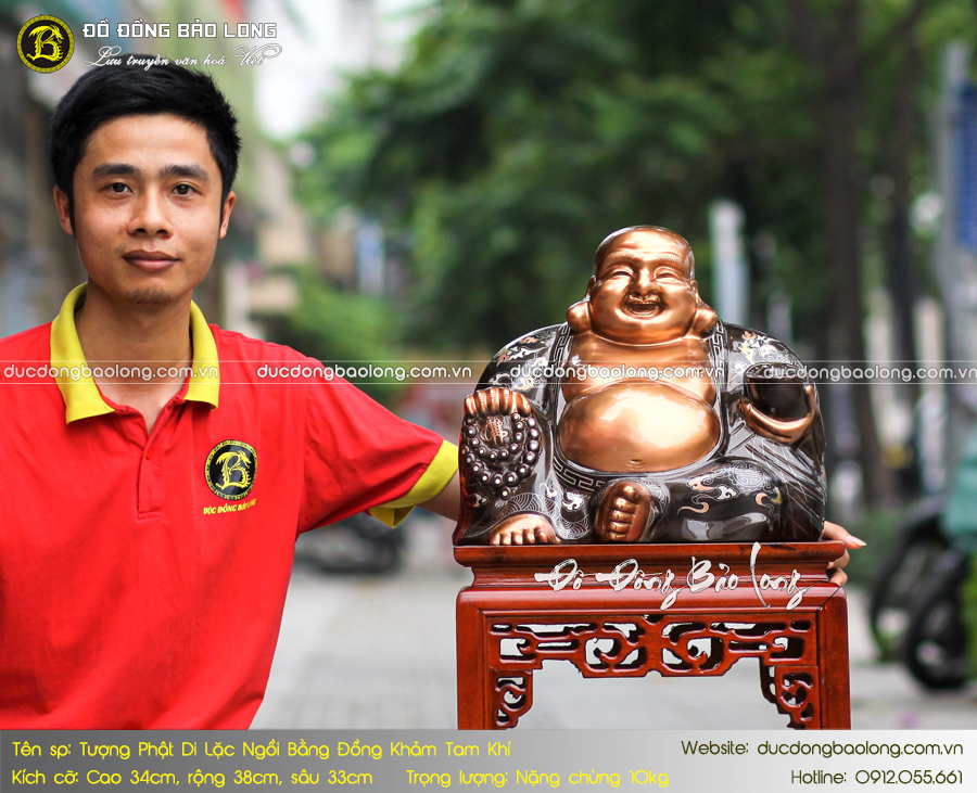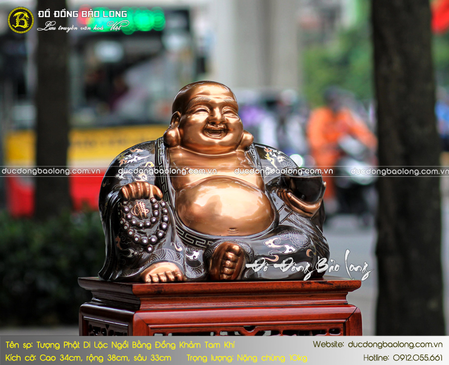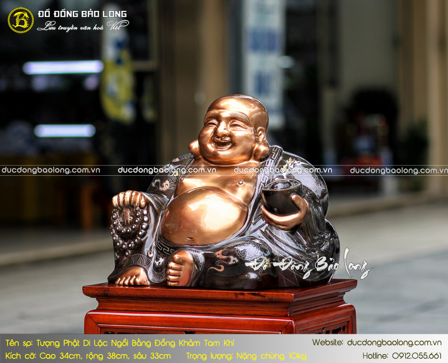 Pho tượng Phật Di Lặc bằng đồng khảm tam khí cao 34cm được chế tác và hoàn thiện bởi nghệ nhân cơ sở Đúc Đồng Bảo Long. Tượng được làm bằng chất liệu đồng nồi hè cực hiếm, màu ốc bưu, hoa văn, họa tiết vô cùng tinh xảo. Tất cả công đoạn chế tác từ khâu tạo mẫu, làm khuôn, nấu đồng, rót đồng, dỡ khuôn và xử lý hoàn thiện đều được thực hiện hoàn toàn thủ công.