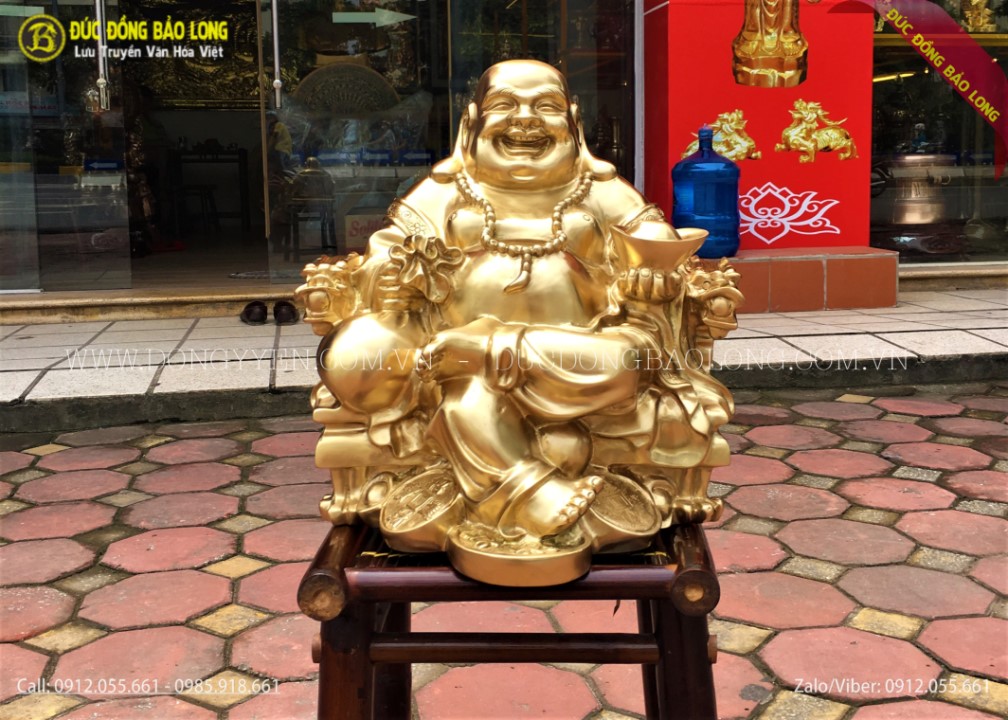 Tượng Đức Phật Di Lặc ngồi ngai rồng, 1 tay cầm chĩnh vàng 1 tay cầm bao tiền vàng, ngồi vắt chân tuyệt đẹp được đúc hoàn toàn thủ công từ đồng vàng, đúc tinh xảo, sản phẩm cao 42cm. Tượng rất phù hợp để bày bàn làm việc, bày bàn trà, bàn tiếp khách sang trọng, hoặc làm quà biếu tặng rất ý nghĩa. Nụ cười hiền hậu của ông Di Lặc sẽ đem lại bình an, hạnh phúc cho mọi người.