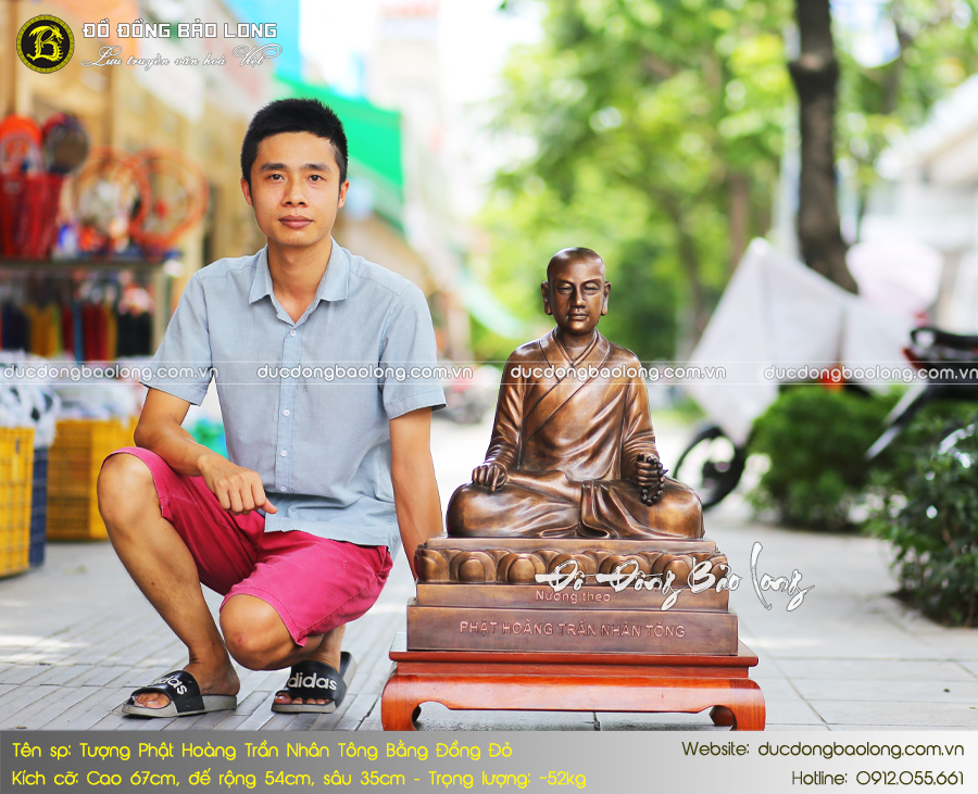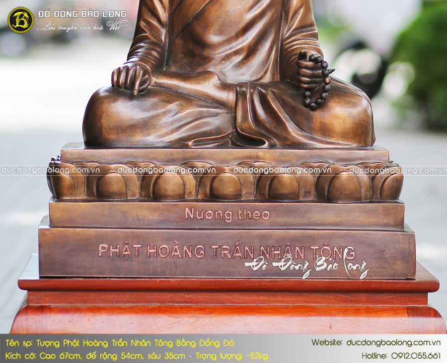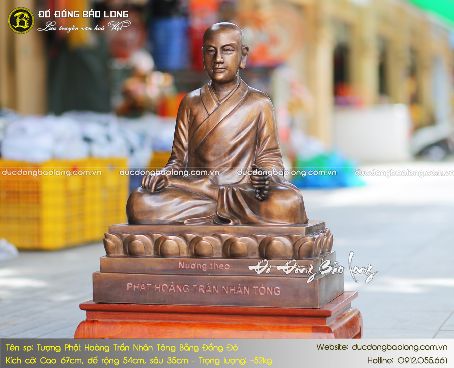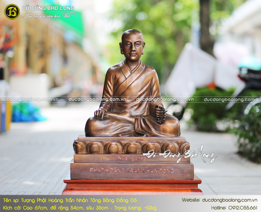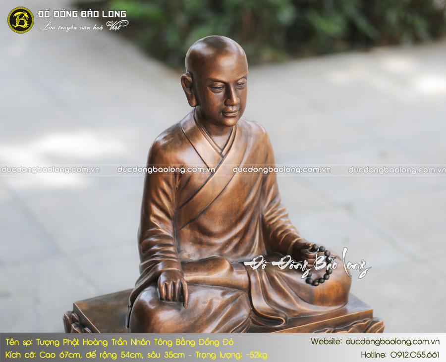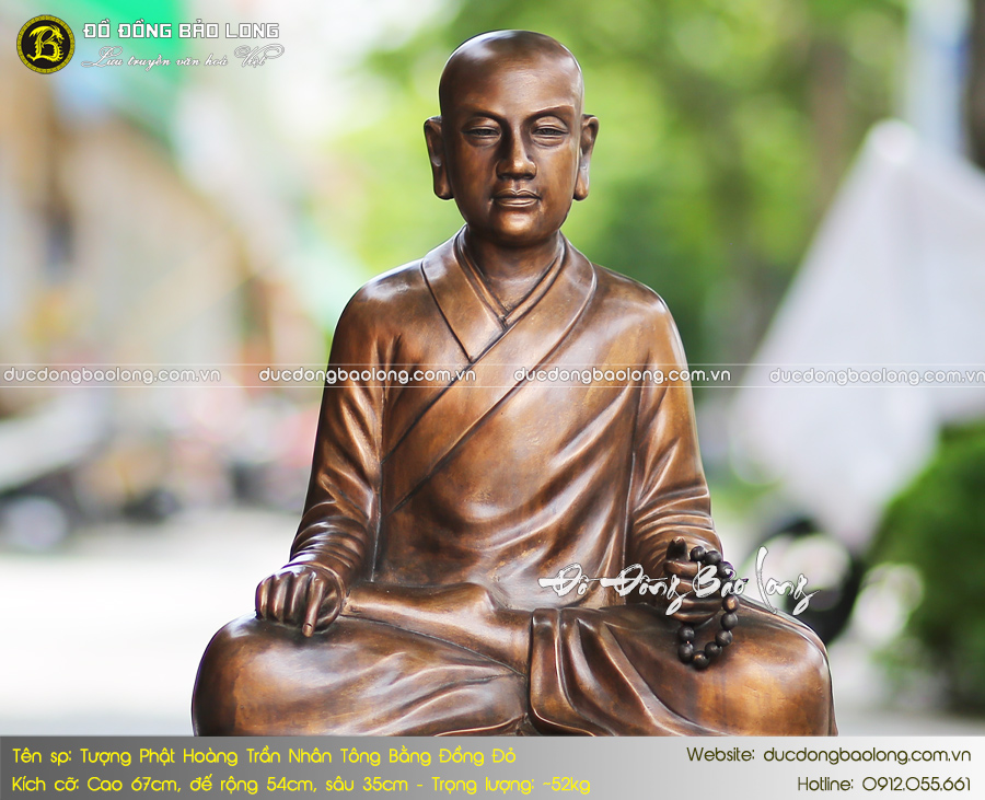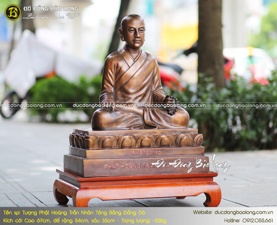 Tượng Phật Hoàng Trần Nhân Tông bằng đồng đỏ hạ màu thời gian cao 67cm được đúc thủ công tinh xảo bằng nguyên liệu đồng đỏ nguyên khối. Bề mặt tượng hạ màu trầm cổ độc đáo, các chi tiết diện mặt thể hiện sự thần thái của vị Phật. Mọi đường nét hoa văn, vạt áo, hình hoa sen, xâu hạt được tái hiện chân thật, tinh tế, đem đến cảm giác chân thực khi chiêm ngưỡng pho tượng.