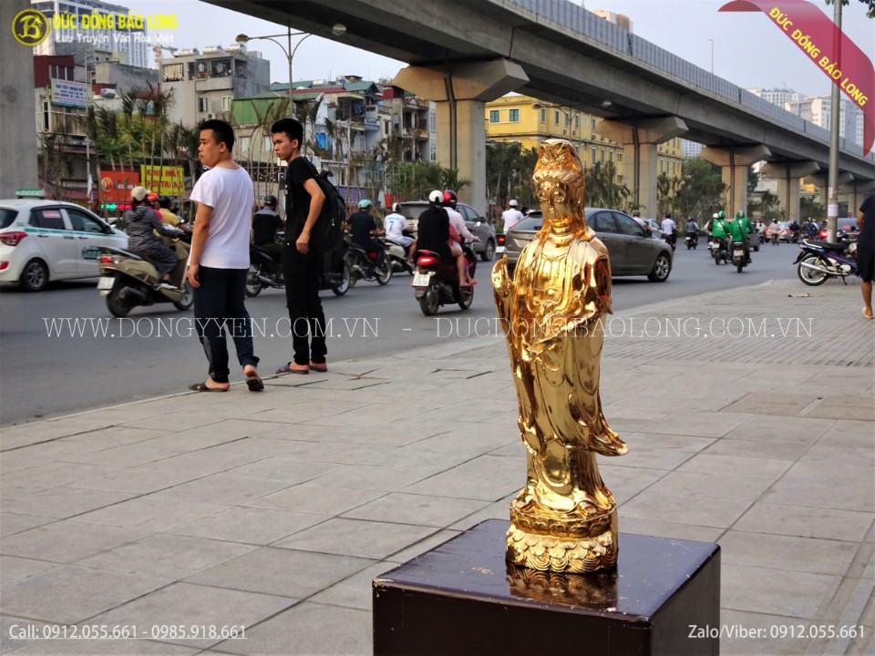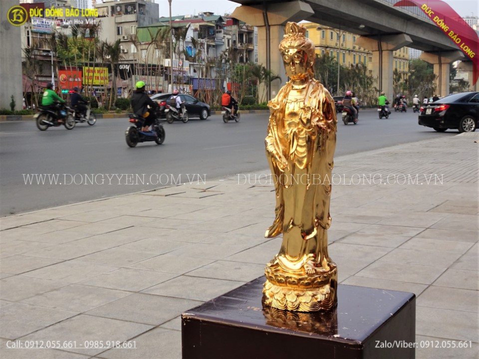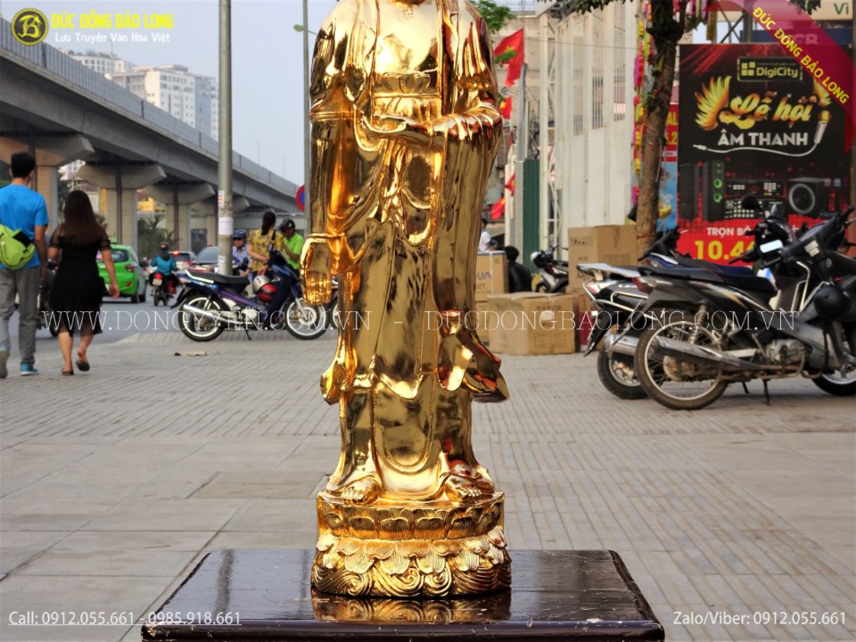 Tượng được đúc hoàn toàn thủ công từ nguyên liệu đồng vàng. Các đường nét, hoa văn được các nghệ nhân chạm rất tỉ mỉ và sắc nét để tượng toát lên vẻ đức hạnh cao cả. Tượng được mạ phủ vàng ròng 24k bằng phương pháp điện phân nhúng bể 3 lớp cao cấp nhất hiện nay. Tượng có màu vàng tươi trông rất đẹp, đảm bảo bề mặt không bị oxi hóa bởi môi trường xung quanh.