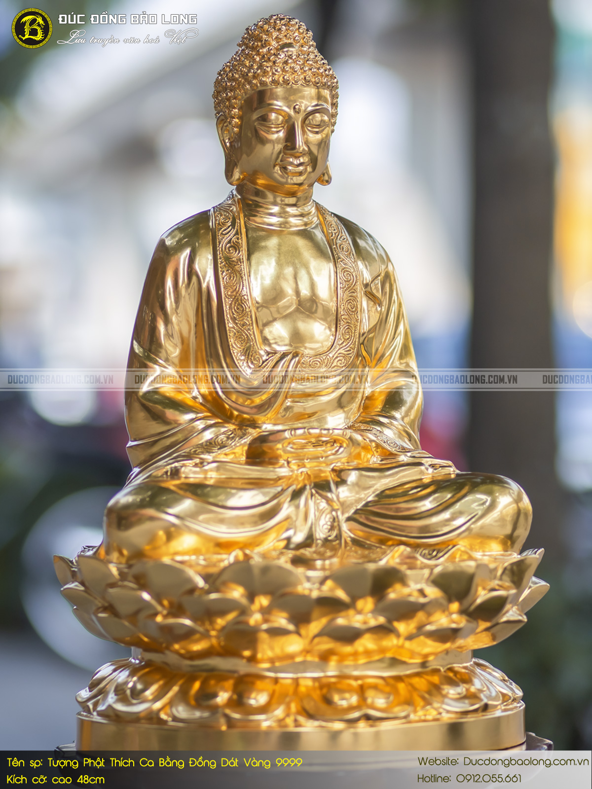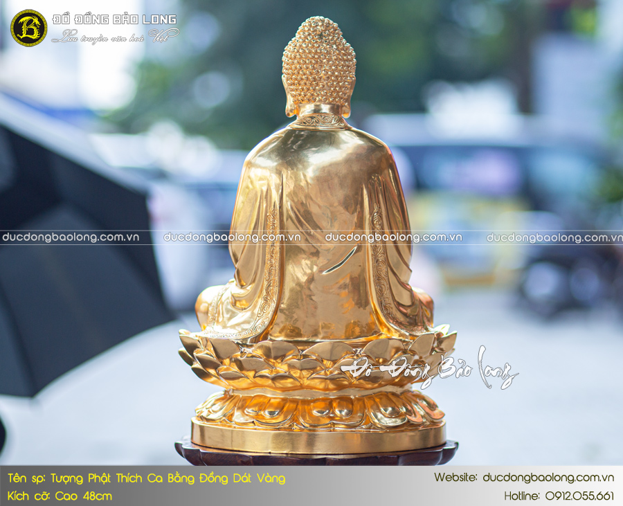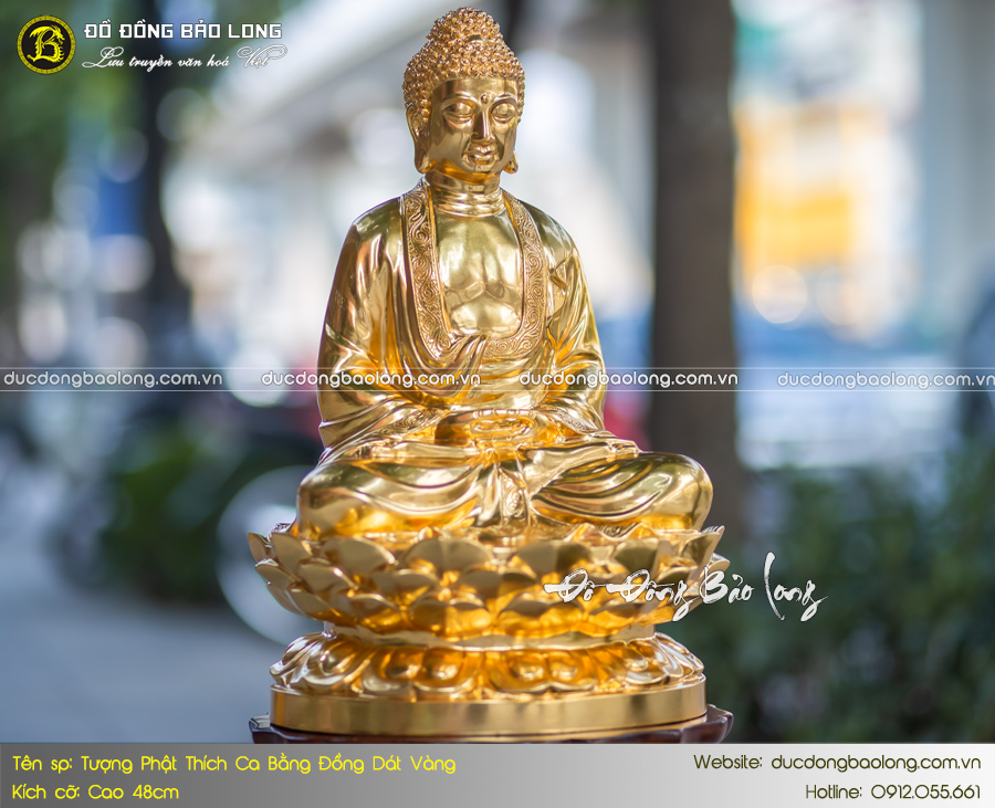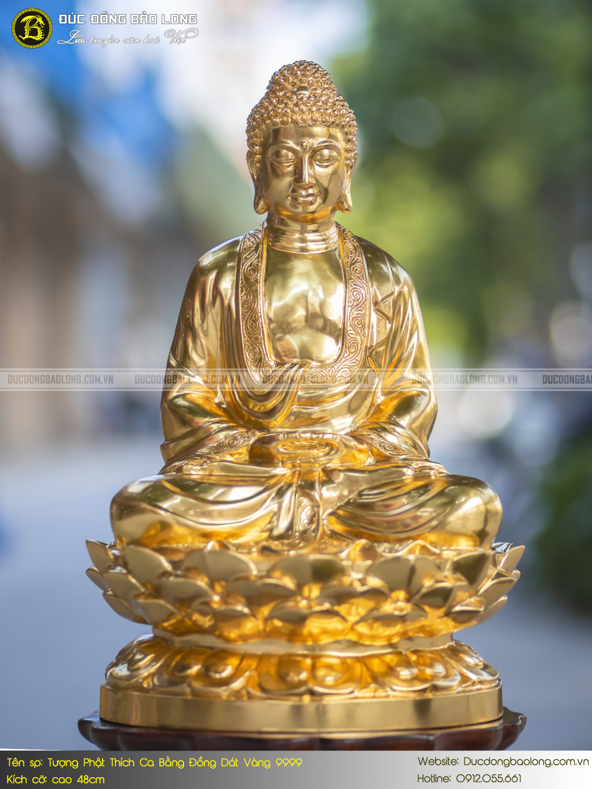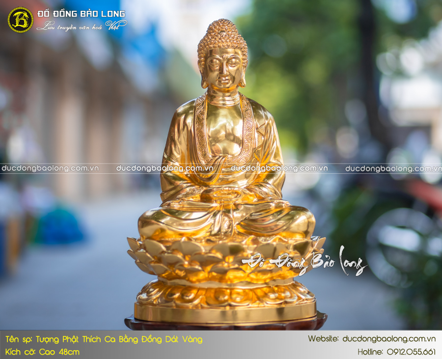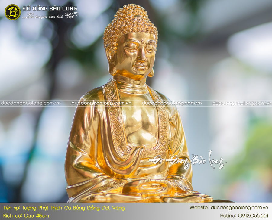 Pho tượng Phật Thích Ca bằng đồng dát vàng cao 48cm được tạo dựng theo mẫu chuẩn, tỷ lệ hình khối cân đối. Bằng khối óc sáng tạo, độ cảm nghệ cao, người nghệ nhân cơ sở Đúc Đồng Bảo Long đã hoàn thiện mẫu tượng có diện mạo cực đẹp, thần thái với kỹ thuật hoàn thiện tốt.