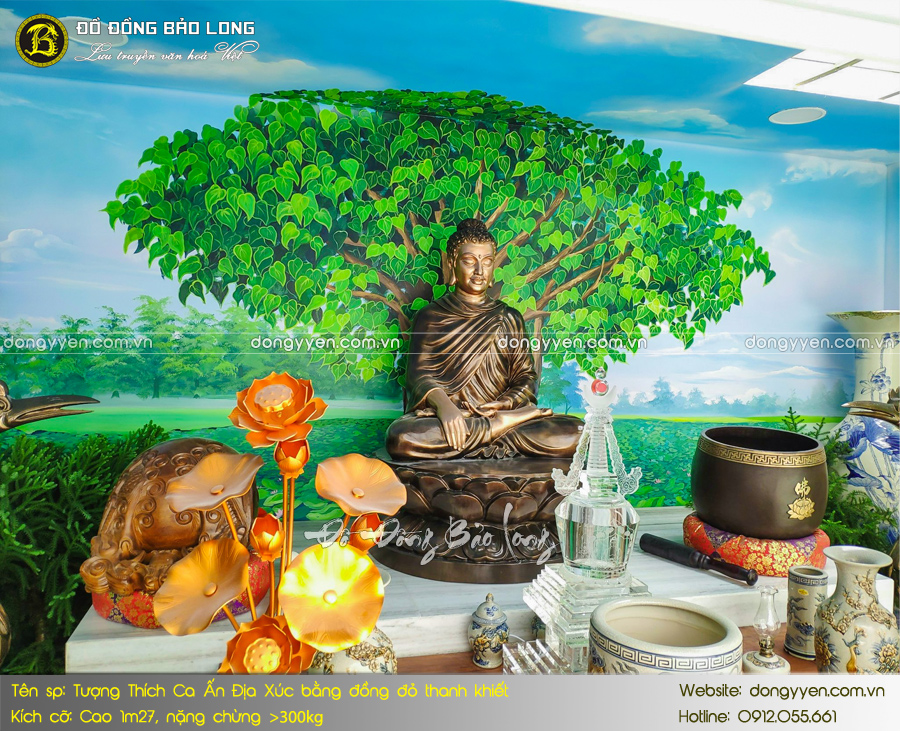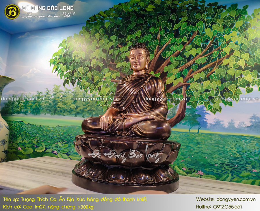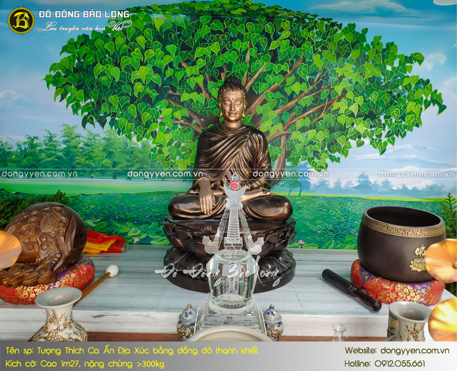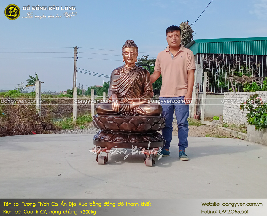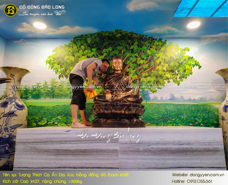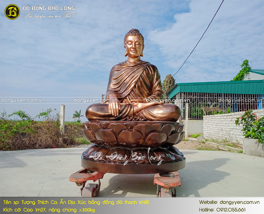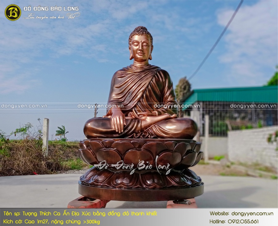 Tượng Phật Thích Ca bắt ấn Địa Xúc bằng đồng 1m27 là mẫu tượng mới nhất của Bảo Long. Sản phẩm dược chế tác từ đồng thanh kiết, hoàn toàn thủ công 100%. Tượng Phật được xử lý màu sắc rất đẹp, các chi tiết được các nghệ nhân tỉ mỉ hoàn thành. Khi nhìn vào pho tượng, ta thấy có hồn hơn, sống động hơn nhiều.