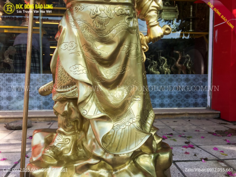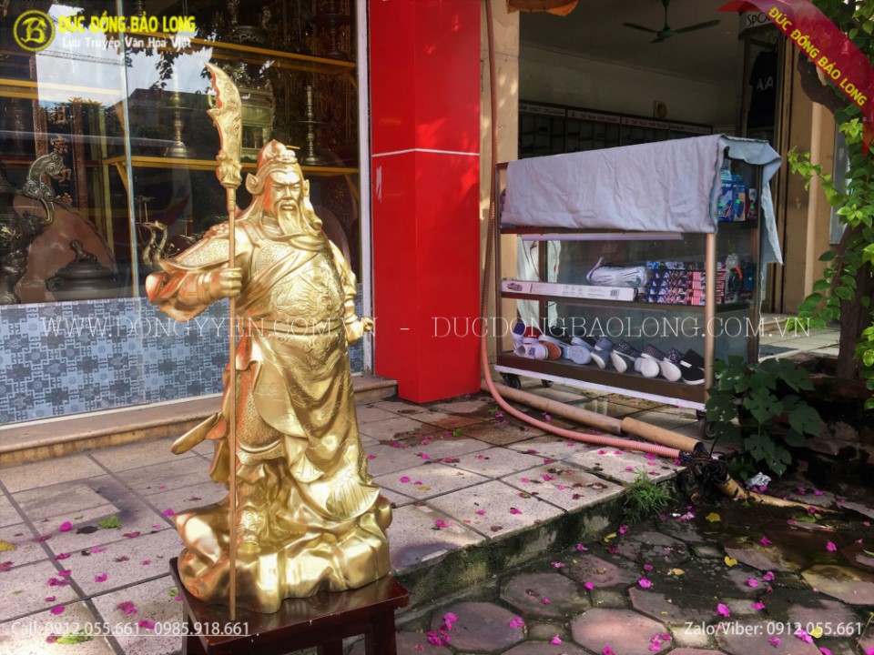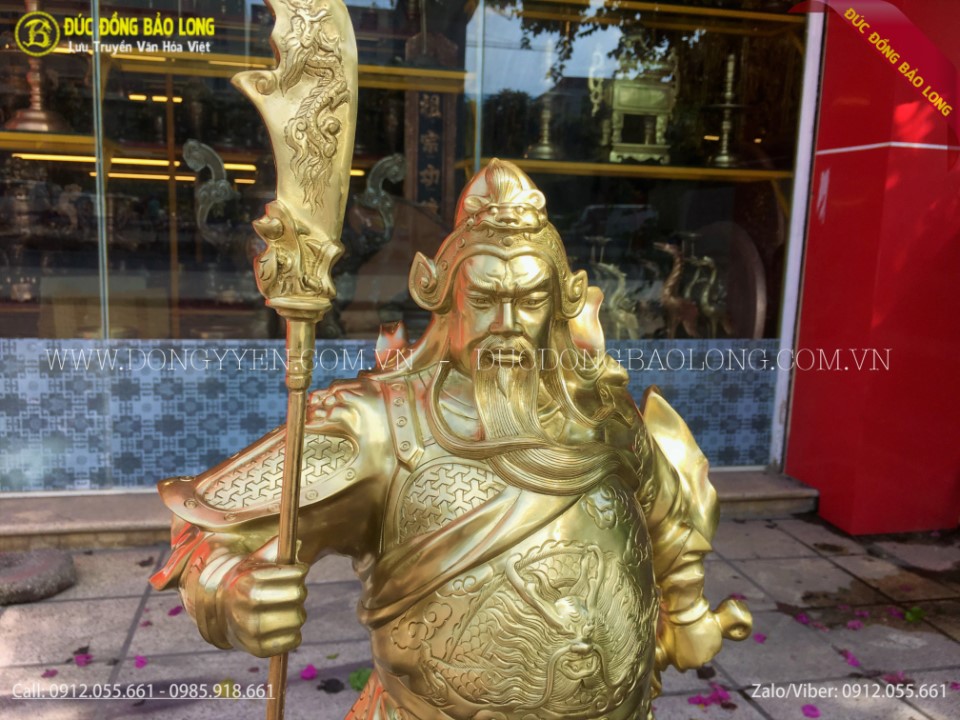 Tượng quan công đứng chống đao 69cm kích thước lựa theo thước lỗ ban đẹp, hoàn toàn là mẫu mới được Bảo Long khai thác trong kho mẫu của những tác giả điêu khắc nổi tiếng của trung quốc, mẫu tượng được tạo dáng hết sức tự nhiên với tư thế đứng trên tảng đá, 1 tay cầm chuôi kiếm, 1 tay chống đao dựng đứng, nét mặt nghiêm nghị, uy nghi vừa thể hiện được khí phách hiên ngang, dũng mãnh vừa lột tả được thần sắc của một vị tướng văn võ song toàn. Nguyên liệu đúc là loại đồng catut - đồng vỏ đạn (loại đồng tốt nhất hiện nay được nhập khẩu từ các đơn vị quân sự tại Liên Xô). Tượng quan công đứng này có kích thước cao 69cm khi hoàn thiện thành phẩm nặng chừng gần 40kg đồng, sẽ có màu vàng ánh xanh đặc trưng.