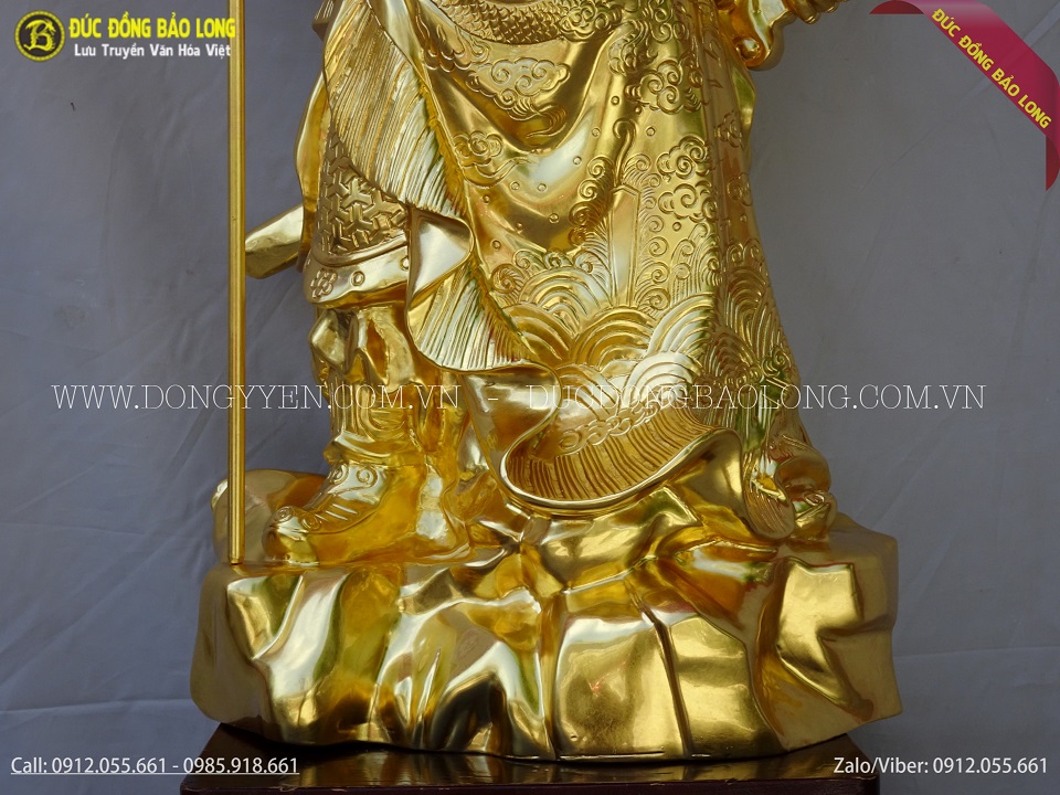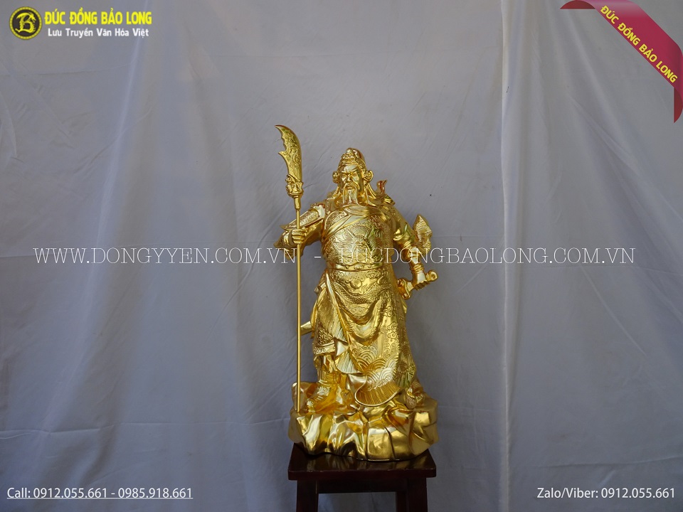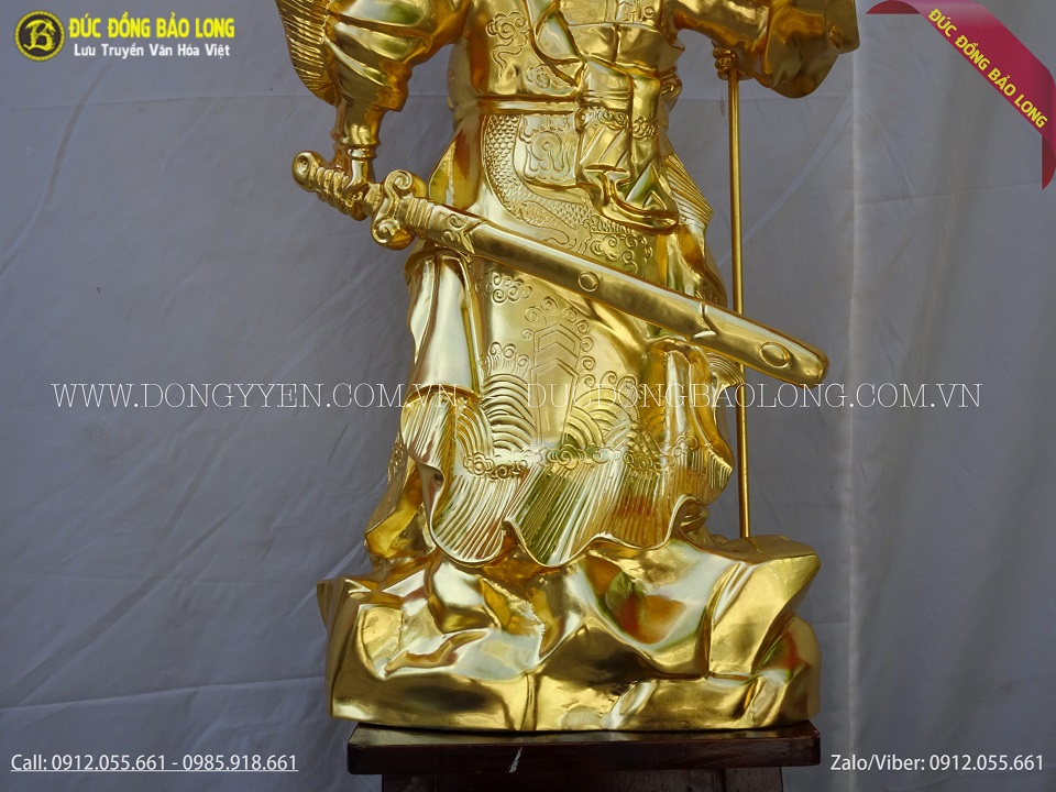Đây là một trong những mẫu tượng quan công đứng chống đao rất đẹp và được rất nhiều người sử dụng. Tượng được chế tác hoàn toàn thủ công từ nguyên liệu bằng đồng đỏ thanh khiết. Sản phẩm được dát vàng 9999 cao cấp. Tượng quan công đứng chống đao 81cm kích thước lựa theo thước lỗ ban đẹp, hoàn toàn là mẫu mới được Bảo Long khai thác trong kho mẫu của những tác giả điêu khắc nổi tiếng của trung quốc, mẫu tượng được tạo dáng hết sức tự nhiên với tư thế đứng trên tảng đá, 1 tay cầm chuôi kiếm, 1 tay chống đao dựng đứng, nét mặt nghiêm nghị, uy nghi vừa thể hiện được khí phách hiên ngang, dũng mãnh vừa lột tả được thần sắc của một vị tướng văn võ song toàn.