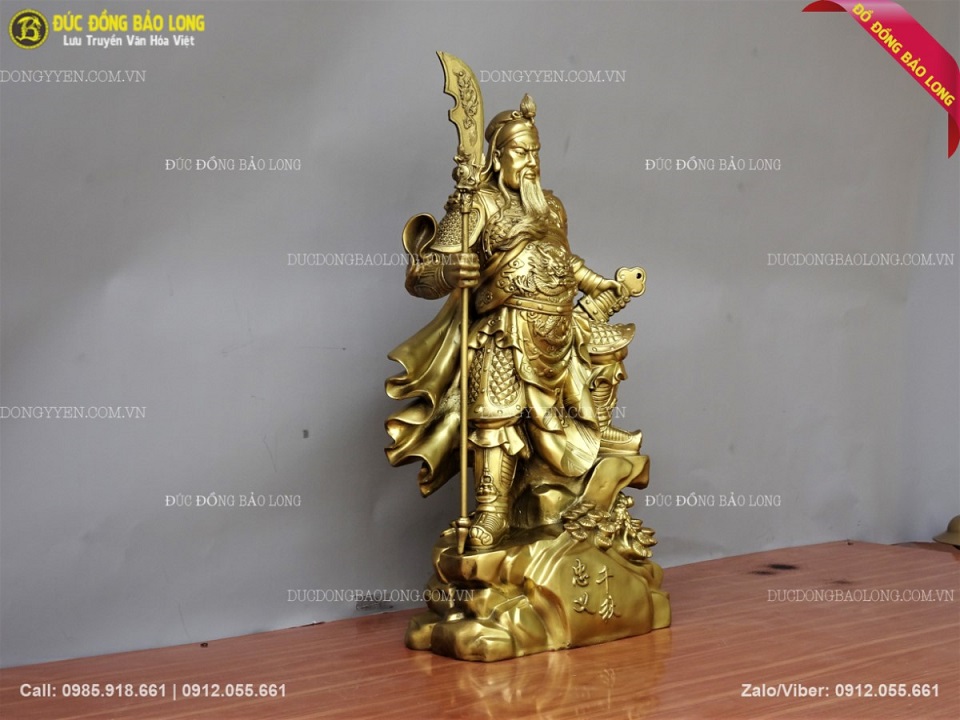 Tượng quan công đứng chống đao 63cm kích thước lựa theo thước lỗ ban đẹp, hoàn toàn là mẫu mới được Bảo Long khai thác trong kho mẫu của những tác giả điêu khắc nổi tiếng của trung quốc, mẫu tượng được tạo dáng hết sức tự nhiên với tư thế đứng trên tảng đá, 1 tay cầm chuôi kiếm, 1 tay chống đao dựng đứng, nét mặt nghiêm nghị, uy nghi vừa thể hiện được khí phách hiên ngang, dũng mãnh vừa lột tả được thần sắc của một vị tướng văn võ song toàn. Nguyên liệu đúc là loại đồng vàng. Tượng quan công đứng này có kích thước cao 63cm. Sản phẩm có màu vàng, sáng rất đẹp. Ngoài ra, chúng tôi nhận hun màu giả cổ, mạ vàng 24k hoặc dát vàng 9999 lên toàn bộ bề mặt sản phẩm.