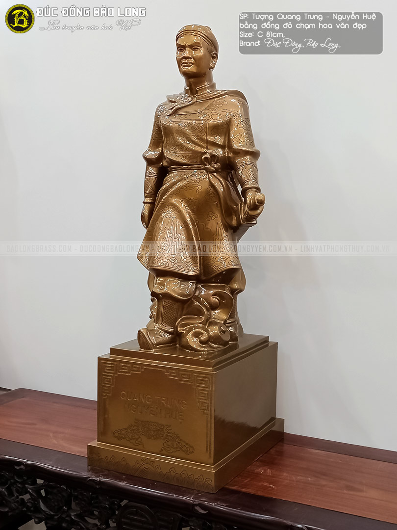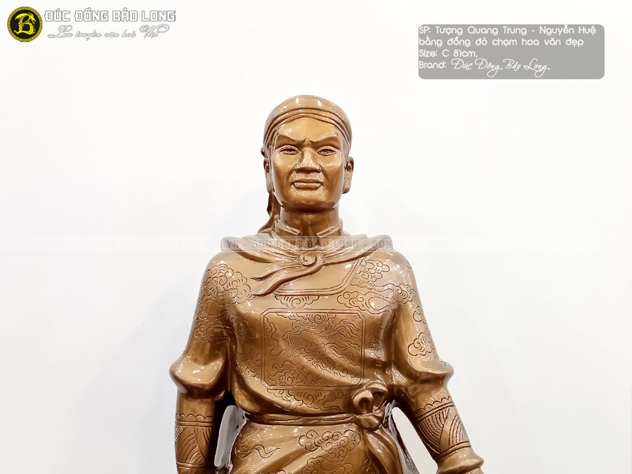Khác xa so với những mẫu tượng phổ thông trên thị trường, pho tượng đồng Vua Quang Trung bằng đồng đỏ cao 81cm màu trầm cổ được khách hàng và giới chuyên môn đánh giá cao bởi hình khối tỷ lệ, cân xứng. Phần vai, thân, người và trang phục có sự cân đối nhất định. Từng đường nét trên gương mặt và trang phục như râu, tóc, cánh chân mày, mũi, miệng mang tính truyền thần cao, vô cùng biểu cảm.