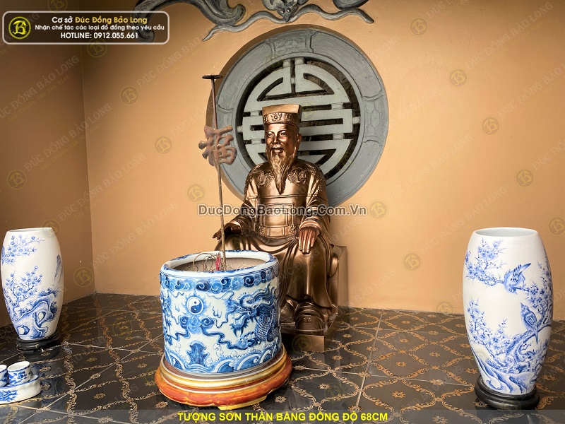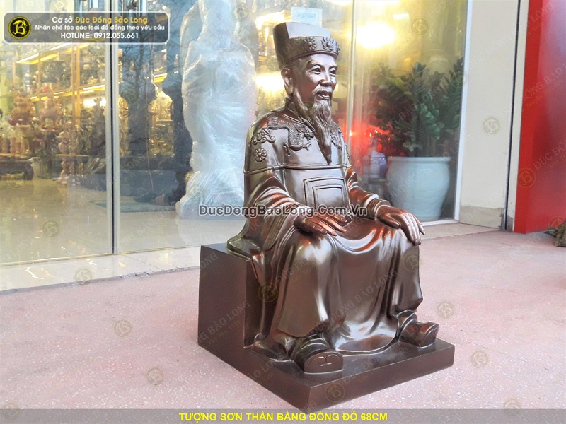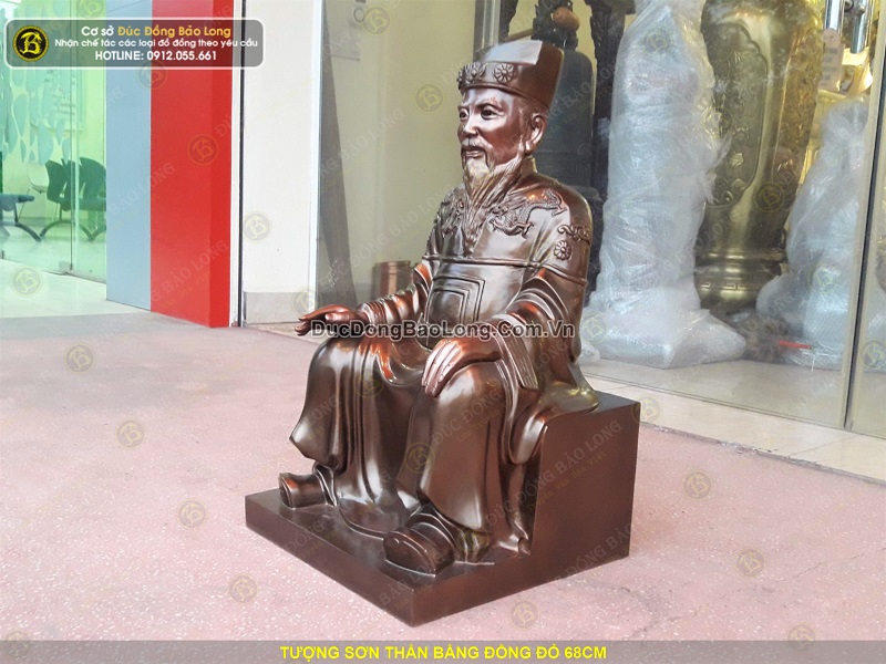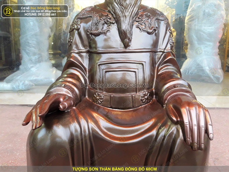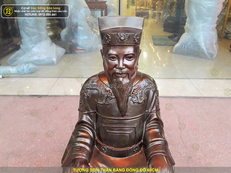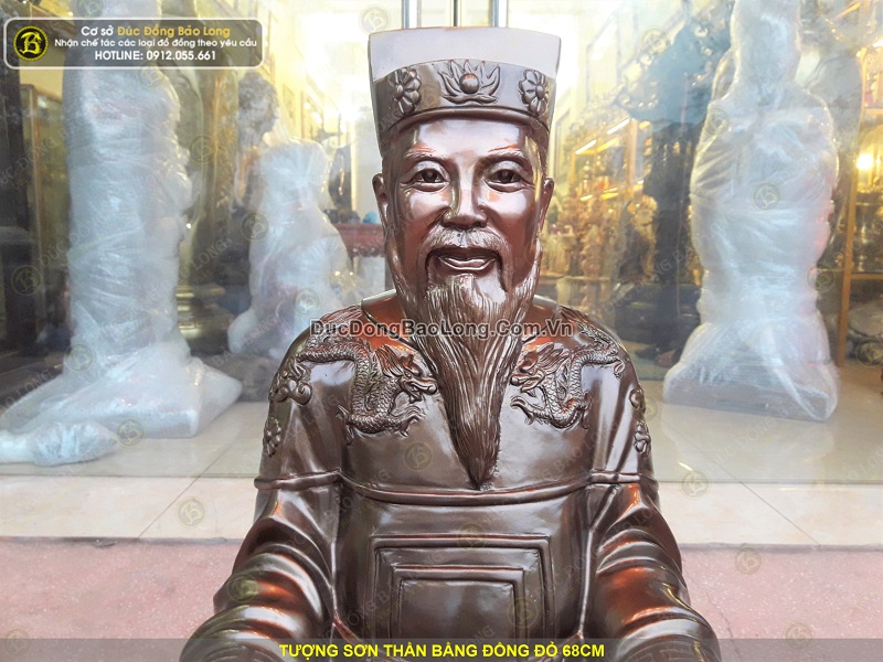 Tượng Sơn Thần được đúc hoàn toàn thủ công từ nguyên liệu đồng đỏ thanh khiết. Tượng được đúc khá dày dặn, sắc nét, có chiều cao tổng thể 68cm. Tượng có cân nặng khoảng 40kg.