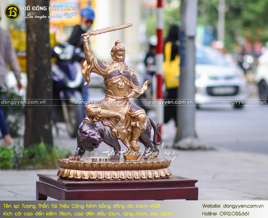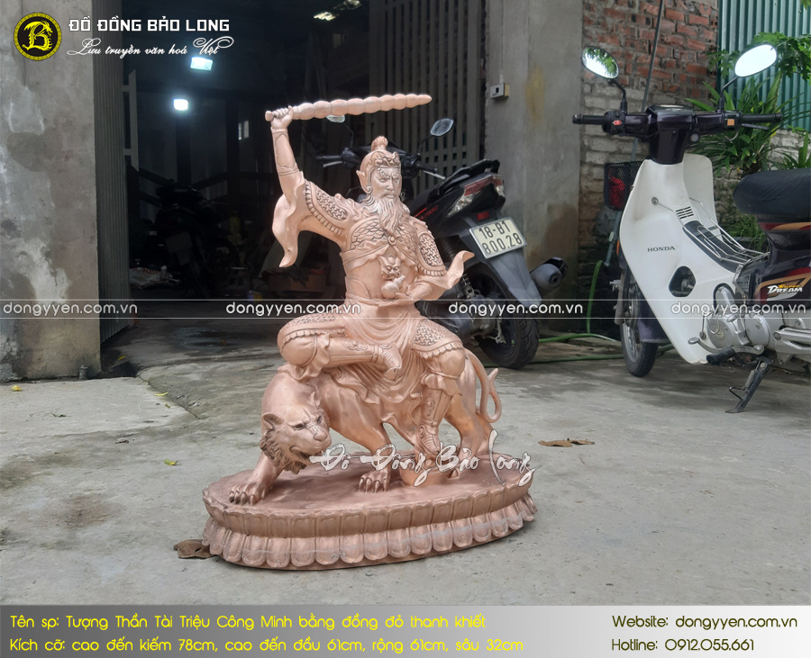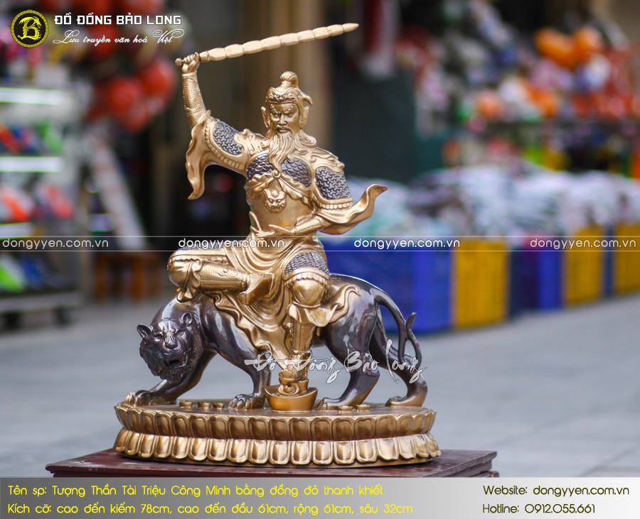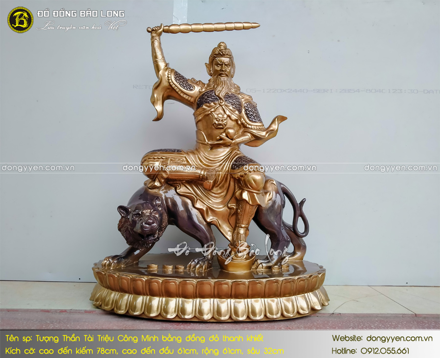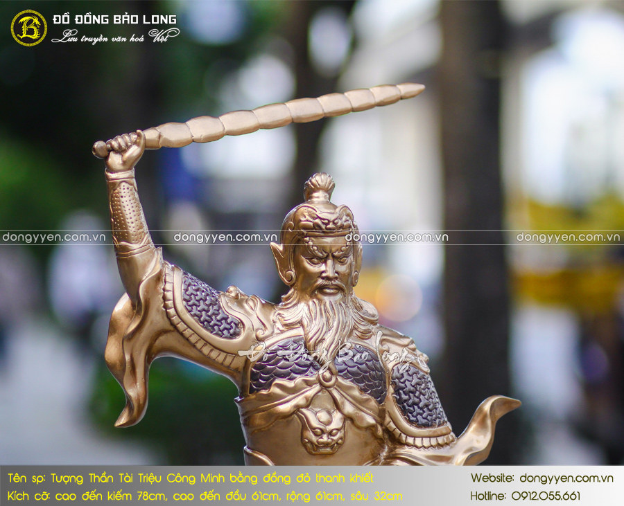 Tượng Thần Tài Triệu Công Minh bằng đồng đỏ cao 61cm là mẫu tượng chế tác riêng của Bảo Long. Sản phẩm dược chế tác từ đồng đỏ thanh kiết, hoàn toàn thủ công 100%. Bề ngoài tượng được sử lý màu sắc làm nổi bật các chi tiết trên tượng. Pho tượng thần độc đáo, ý nghĩa thích hợp thờ tại gia.