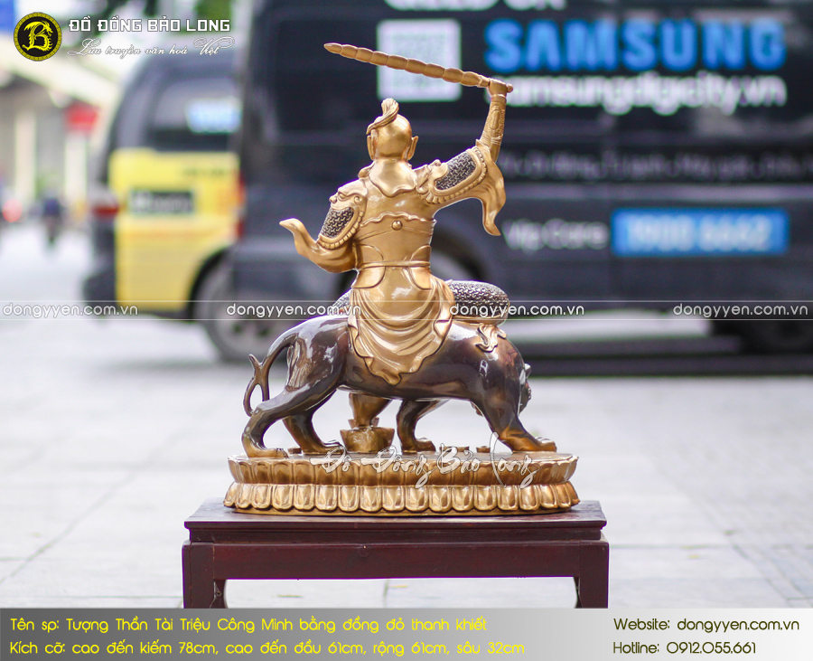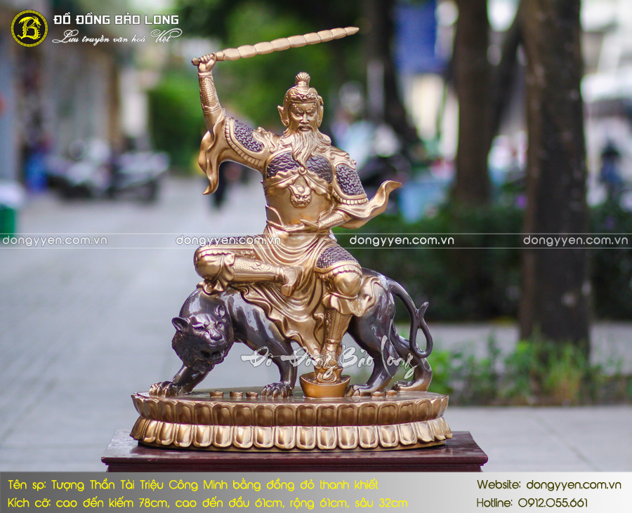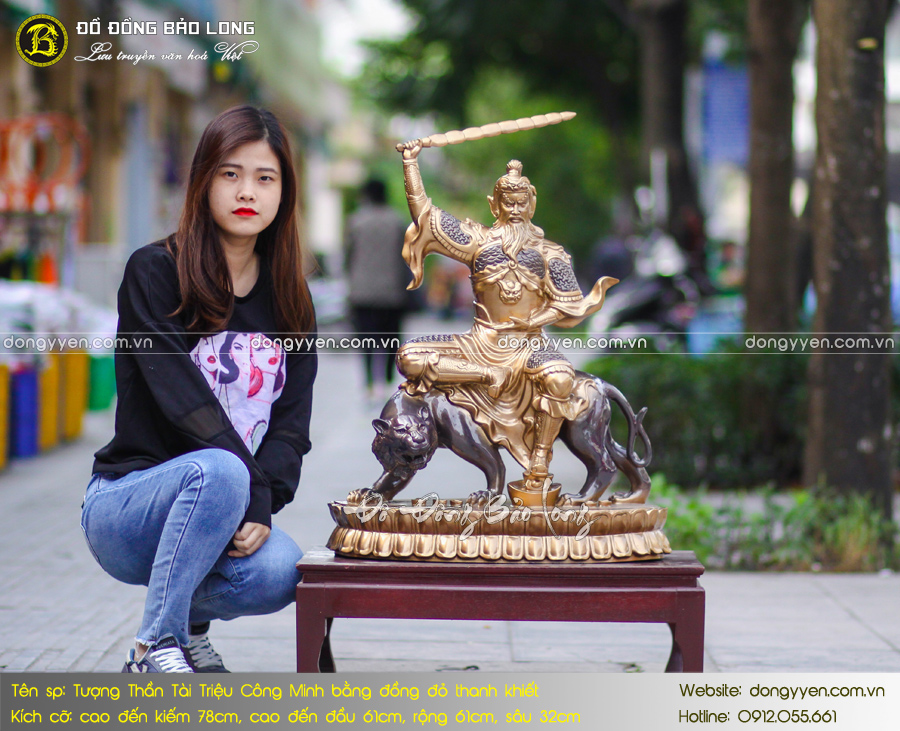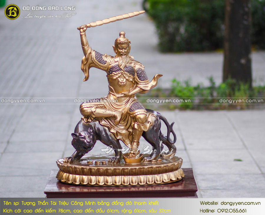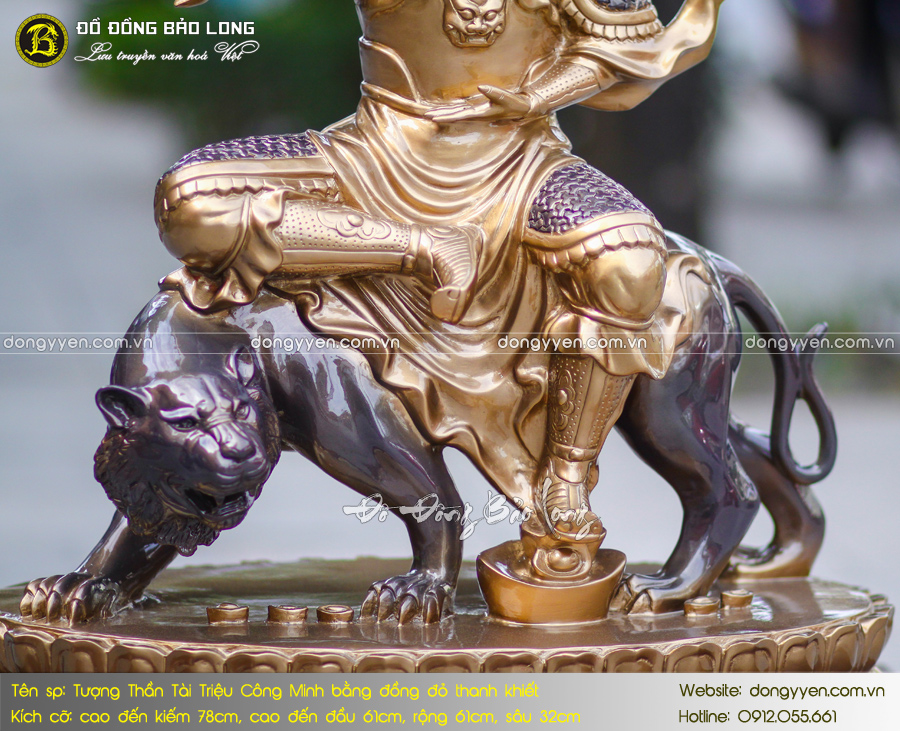 Tượng Thần Tài Triệu Công Minh bằng đồng đỏ cao 61cm là mẫu tượng chế tác riêng của Bảo Long. Sản phẩm dược chế tác từ đồng đỏ thanh kiết, hoàn toàn thủ công 100%. Bề ngoài tượng được sử lý màu sắc làm nổi bật các chi tiết trên tượng. Pho tượng thần độc đáo, ý nghĩa thích hợp thờ tại gia.