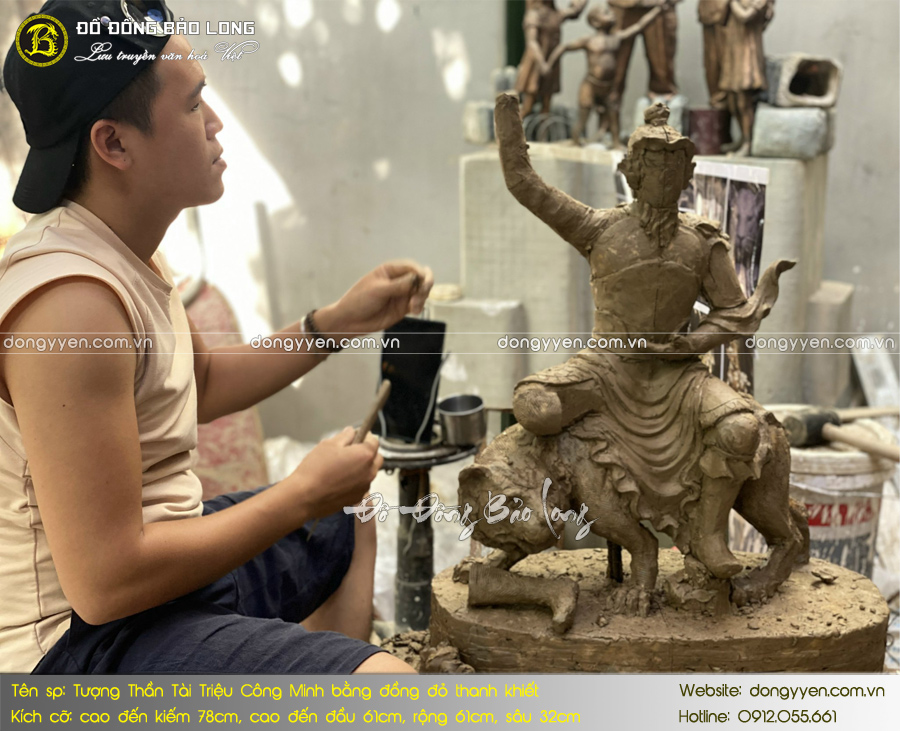 Giống như các pho tượng đồng thủ công khác, để chế tác ra pho tượng Thần Tài Triệu Công Minh, các nghệ nhân thường trải qua 7 bước chế tác. Từ dựng mẫu, làm khuôn, nấu đồng, đồng đỏ, sửa nguội hay hoàn thành,... đều được làm tỉ mỉ, công phu. Bởi việc chế tác thủ công này đòi hỏi người thợ có tay nghề cao, chất liệu hoàn hảo và thời gian lâu. Chính vì vậy, pho tượng đồng sẽ có kiểu dáng đẹp mắt, hoàn hảo, có hồn. Màu sắc hay độ bền đều gần như tuyệt đối.
