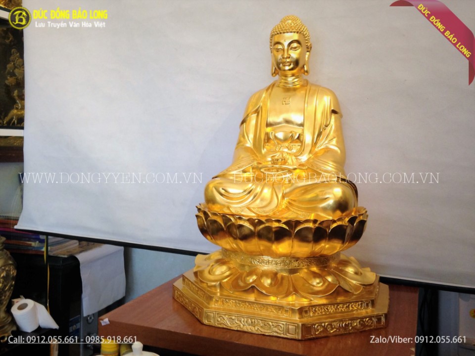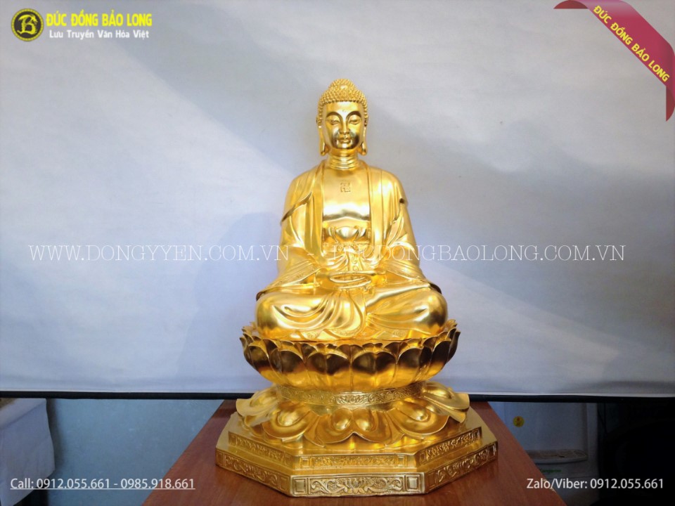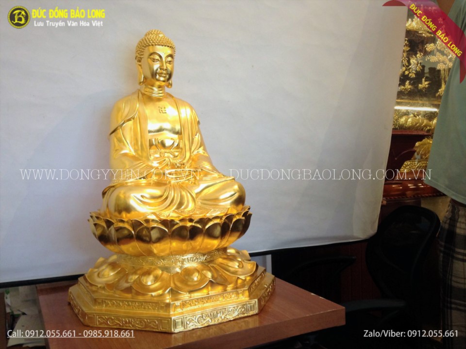 Tượng Phật Bổn Sư Thích Ca Mâu Ni ngồi đài sen cao 68cm được đúc tinh xảo sắc nét, các nghệ nhân đúc hoàn toàn thủ công từ đồng vàng, tượng được dát vàng 9999 cực đẹp, đế tạo tầng bát giác đẹp mắt, sản phẩm theo đơn đặt hàng của khách hàng đi cung tiến tại Sóc Trăng.