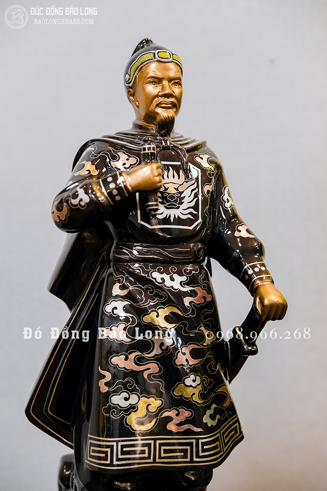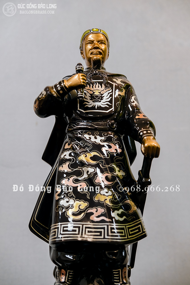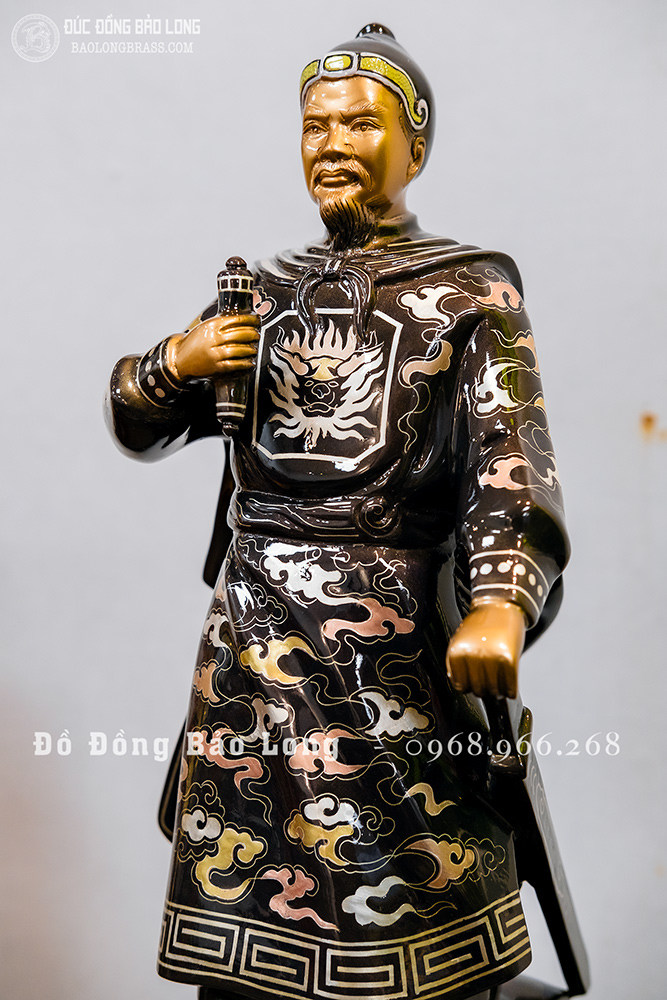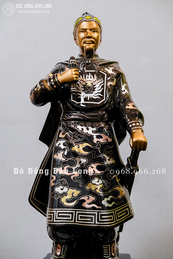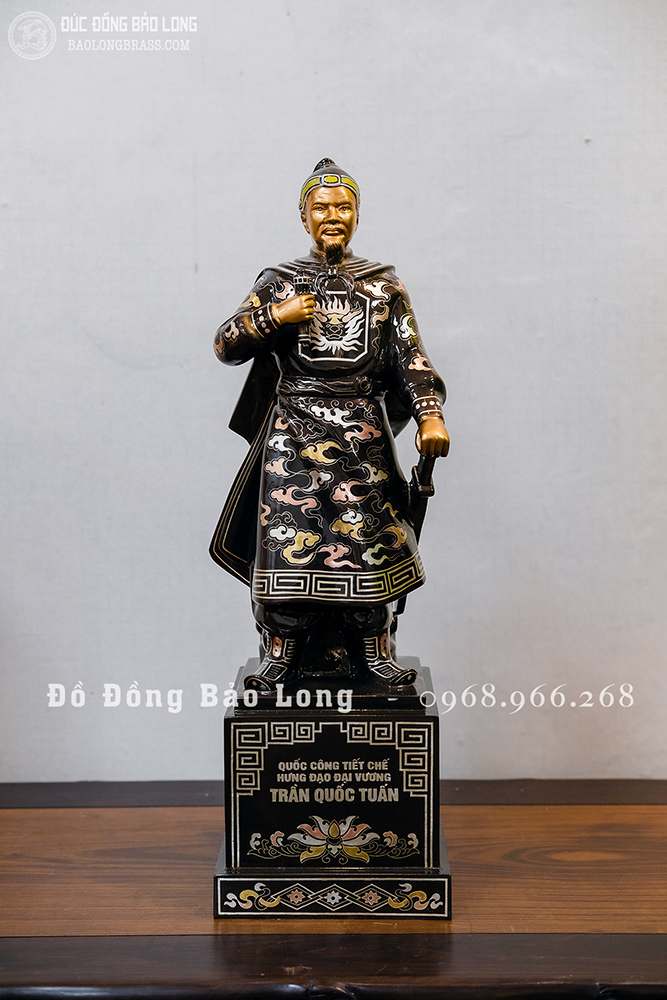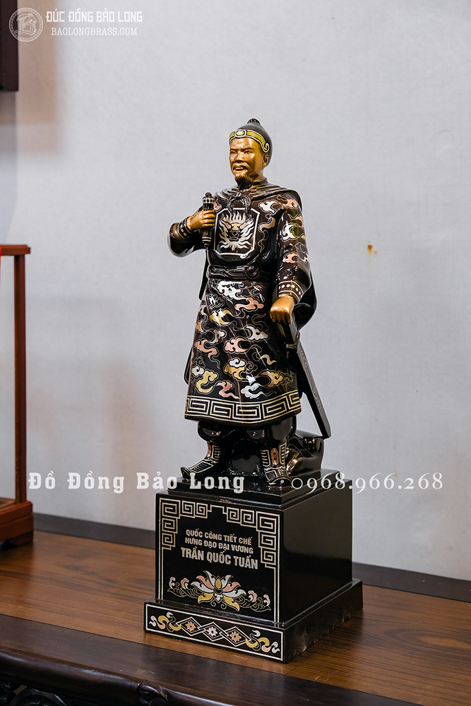 Điểm nổi bật của pho tượng Trần Hưng Đạo là bề mặt được xử lý màu ốc bươu độc đáo, tạo chiều sâu cổ kính và sang trọng. Các chi tiết hoa văn trên trang phục, khuôn mặt và bệ tượng đều được chạm khắc sắc nét, thể hiện rõ khí chất anh hùng và tinh thần bất khuất của Đức Thánh Trần. Đây là sản phẩm vừa mang giá trị nghệ thuật, vừa có ý nghĩa phong thủy sâu sắc.