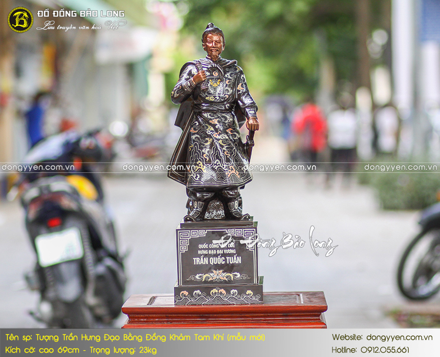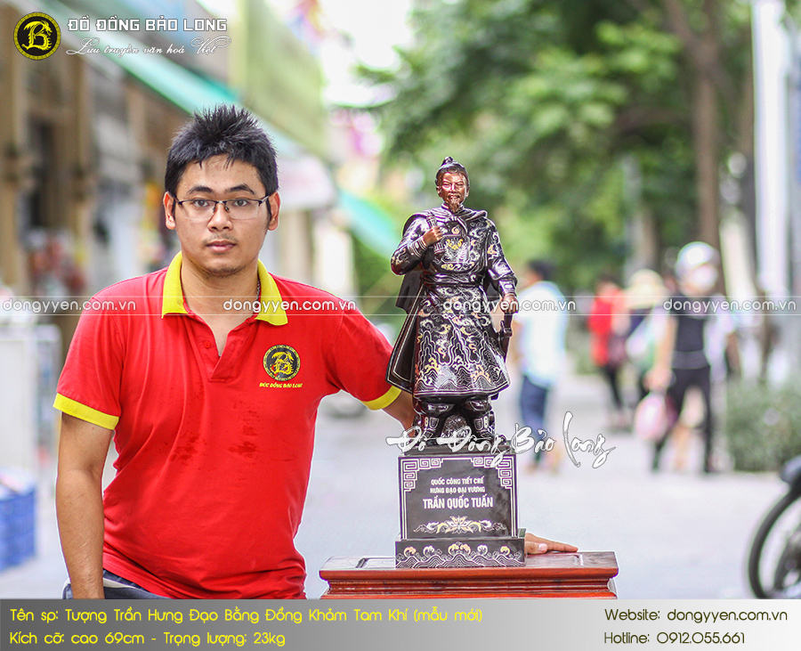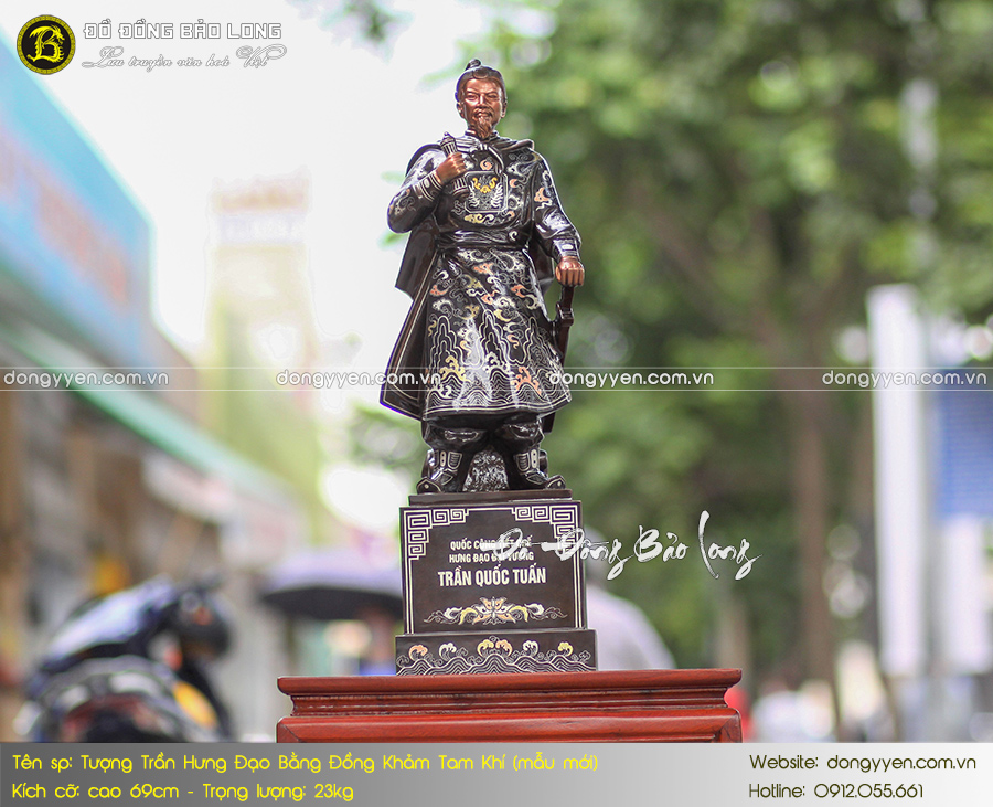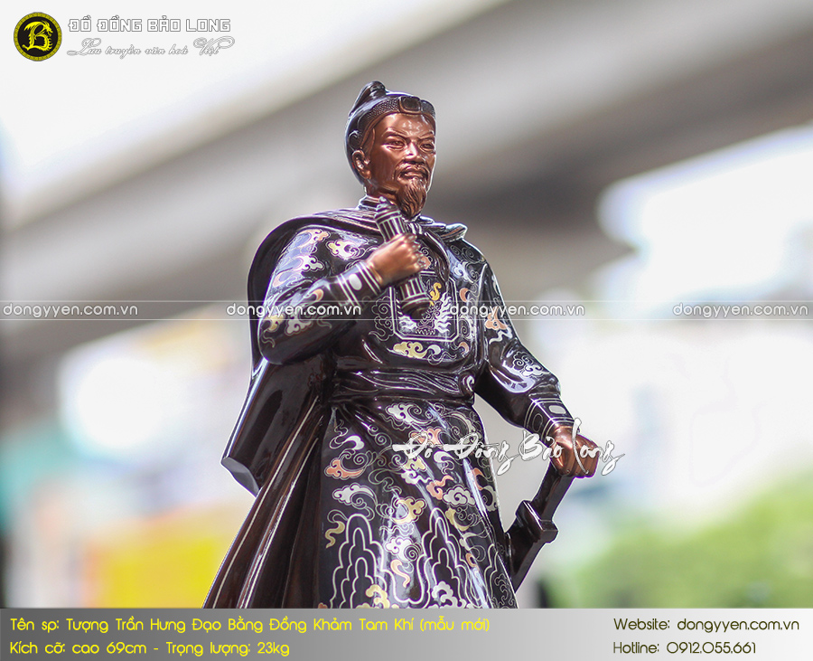 Tượng Trần Hưng Đạo khảm Tam khí mẫu mới cao 69cm được đúc thủ công tại xưởng Bảo Long. Sản phẩm có chất lượng tốt, thẩm mĩ cao.