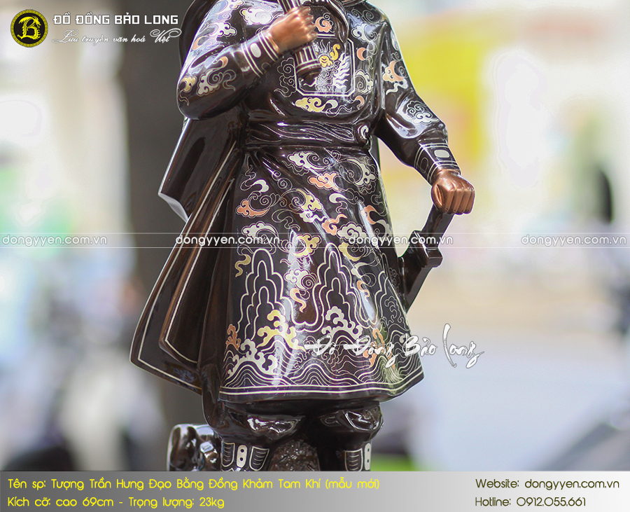 Tượng Trần Hưng Đạo khảm Tam khí mẫu mới cao 69cm là sản phẩm mới nhất, được chế tác độc quyền tại Bảo Long. Sản phẩm được cải tiến từ mẫu cũ, từ kiểu dáng, hoa văn đều độc đáo, thẩm mĩ cao. Tượng có chất lượng cao cấp, tuổi thọ gần như mãi mãi. Pho tượng thích hợp trưng bày trong phòng khách, phòng làm việc hay phòng thờ. Ngoài ra, đây cũng là đồ phong thủy tốt để làm quà tặng.
