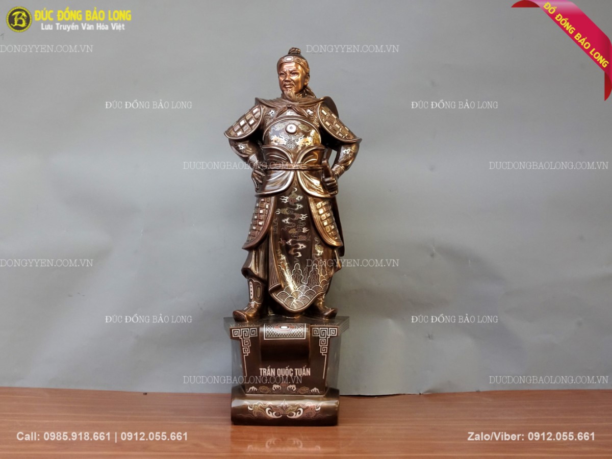Bảo Long xin giới thiệu tượng Trần Hưng Đạo với mẫu hoàn toàn mới vừa được chúng tôi tìm tòi và chế tác thành công. Tượng được tạo hình theo dáng đứng cầm đao tay chống nạnh, mặc áo giáp tre chiến đấu với đế tượng trưng cho mũi thuyền, khuôn mặt ngài rất thần thái. Tượng được đúc hoàn toàn thủ công từ nguyên liệu đồng nồi hè, toàn bộ sản phẩm được mài dũa, chạm rất tỉ mỉ, sau đó được khảm tam khí đồng, bạc, đồng vàng, đồng xanh, đồng đen lên bề mặt với những hoa văn đẹp mắt. Hiện tại, mẫu tượng này đang là độc quyền duy nhất tại Bảo Long nếu quý khách hàng bắt gặp mẫu tượng này ngoài thị trường thì chắc hẳn đây là sản phẩm nhái, sao chép lại.