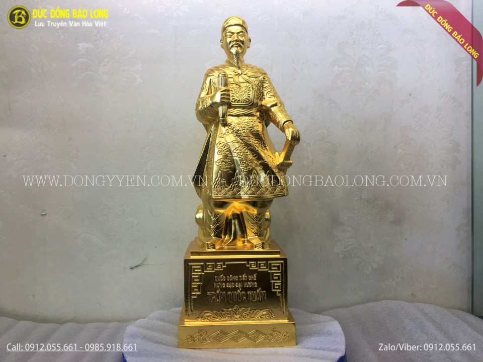Tượng Trần Quốc Tuấn có kích thước 61cm theo thước lỗ ban đẹp. Tượng được đúc hoàn toàn thủ công từ nguyên liệu đồng đỏ thanh khiết. Tượng được mài dũa, chạm tinh xảo các đường nét, mài nhẵn bề mặt và được chúng tôi tiến hành dát vàng 9999 bằng những miếng vàng quỳ - loại vàng ta. Tượng rất phù hợp để trưng bày bàn làm việc, bày tủ, đặt trên đôn gỗ nơi phòng khách, là một trong những món đồ được rất nhiều người chọn làm quà biếu tặng, đặc biệt là quà biếu sếp, lãnh đạo hoặc bạn bè người thân.