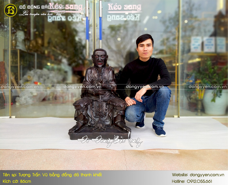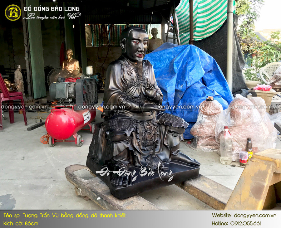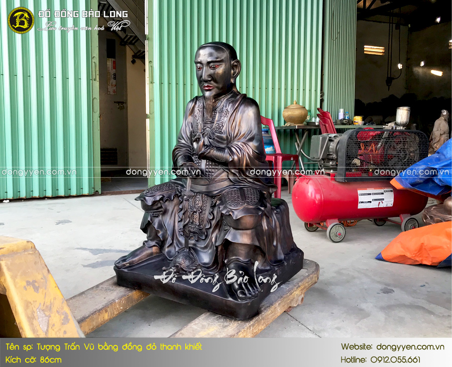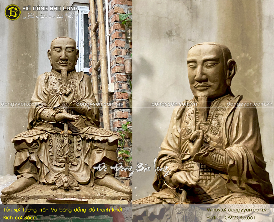 Tượng Trấn Vũ được đúc hoàn toàn thủ công bằng chất liệu đồng đỏ thanh khiết. Tượng được đúc theo dáng ngồi trên bệ. Tượng được đúc khá dày sặn, mọi hoa văn được nét được chạm vô cùng tinh tế, sắc nét. Màu sắc của pho tượng được giữ nguyên màu đồng đỏ cực đẹp.