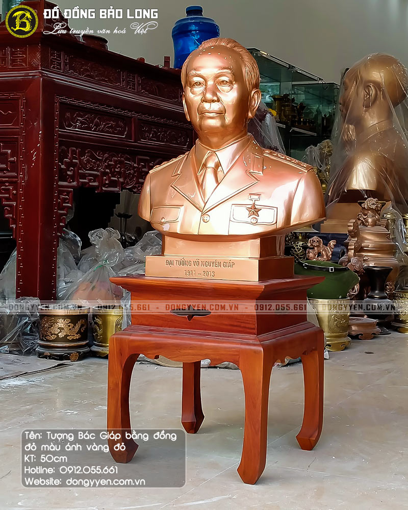 + Tượng Võ Nguyên Giáp bằng đồng đỏ: Hay còn gọi là đồng dây điện, chất lượng hoàn thiện cực tốt do đặc tính, tỷ lệ đồng thanh khiết >90%. Sản phẩm có nhiều sự lựa chọn về màu sắc như màu đỏ mộc nguyên bản hoặc hạ màu thời gian độc đáo. Các mẫu tượng bằng đồng đỏ có độ bền gần như trường tồn cùng thời gian.