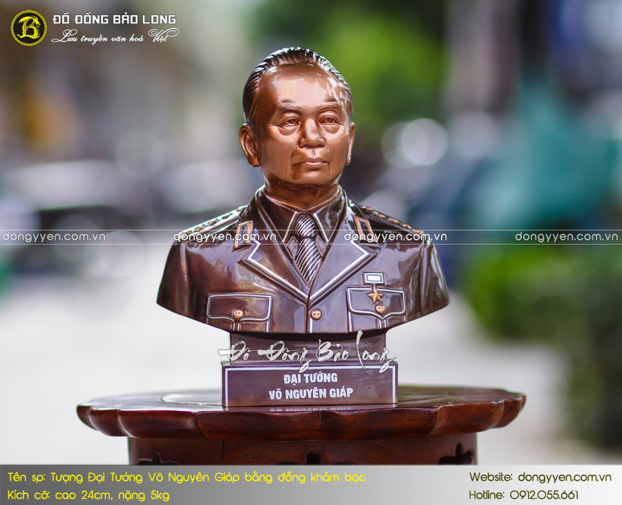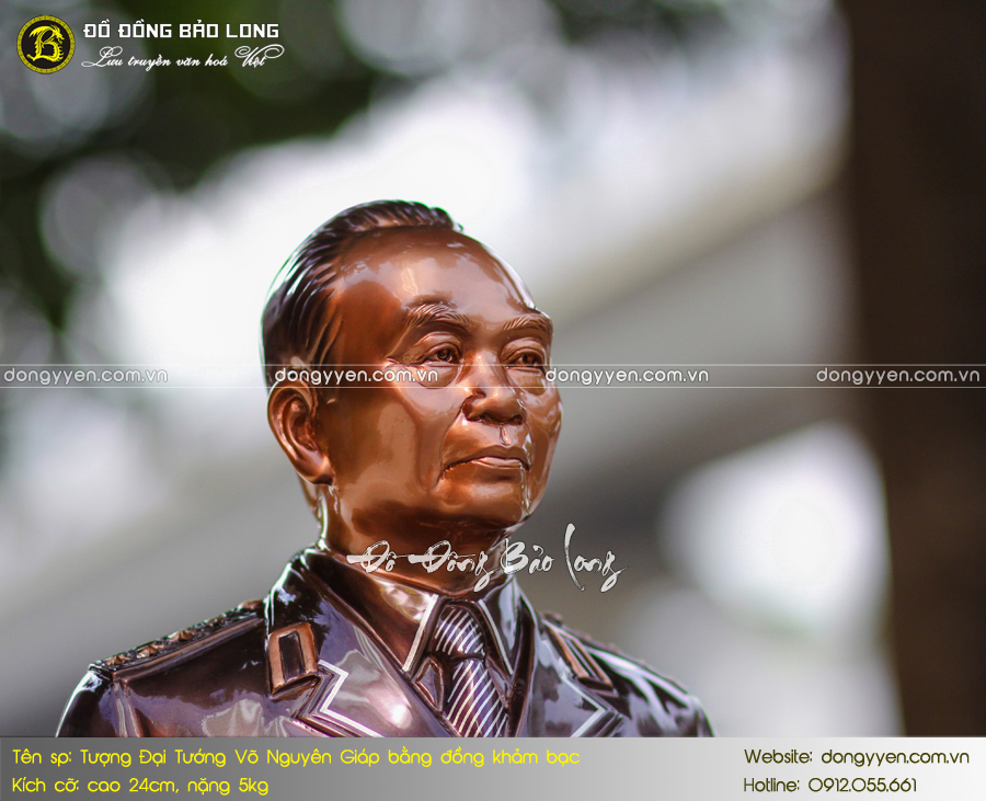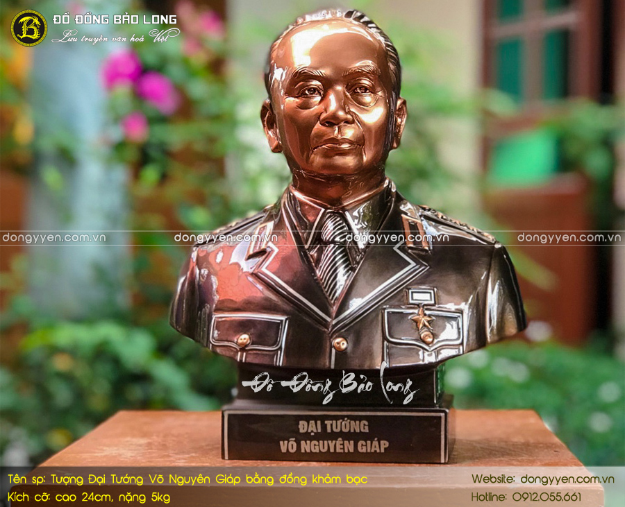 Tượng Võ Nguyên Giáp bán thân khảm bạc cao 24cm là mẫu tượng mới nhất của Bảo Long. Sản phẩm dược chế tác từ đồng thanh kiết, hoàn toàn thủ công 100%. Bề ngoài tượng được khảm bạc vào các chi tiết hoa văn, việc này để tăng tính thẩm mĩ cho tượng. Pho tượng Võ Nguyên Giáp chế tác tinh xảo, bề mặt đẹp mắt, có hồn. Đây là lựa chọn hoàn hảo để bày phòng khách hay hội trường, phòng họp...