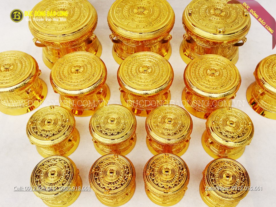 Quả trống đồng kích cỡ nhỏ đường kính 10cm, 12cm, 15cm, 20cm… thường có hộp đi kèm dùng làm quà tặng hội nghị, đối tác được đúc từ đồng vàng, hoạ tiết nổi, có màu vàng của đồng mộc hoặc mạ vàng 24k đẳng cấp. Trống đồng quà tặng có giá từ 650k đến 6tr đồng tuỳ kích cỡ và số lượng.