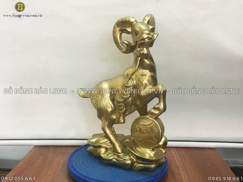 Tượng Dê phong thủy đứng trên tiền cao 41cm đúc bằng đồng vàng katut